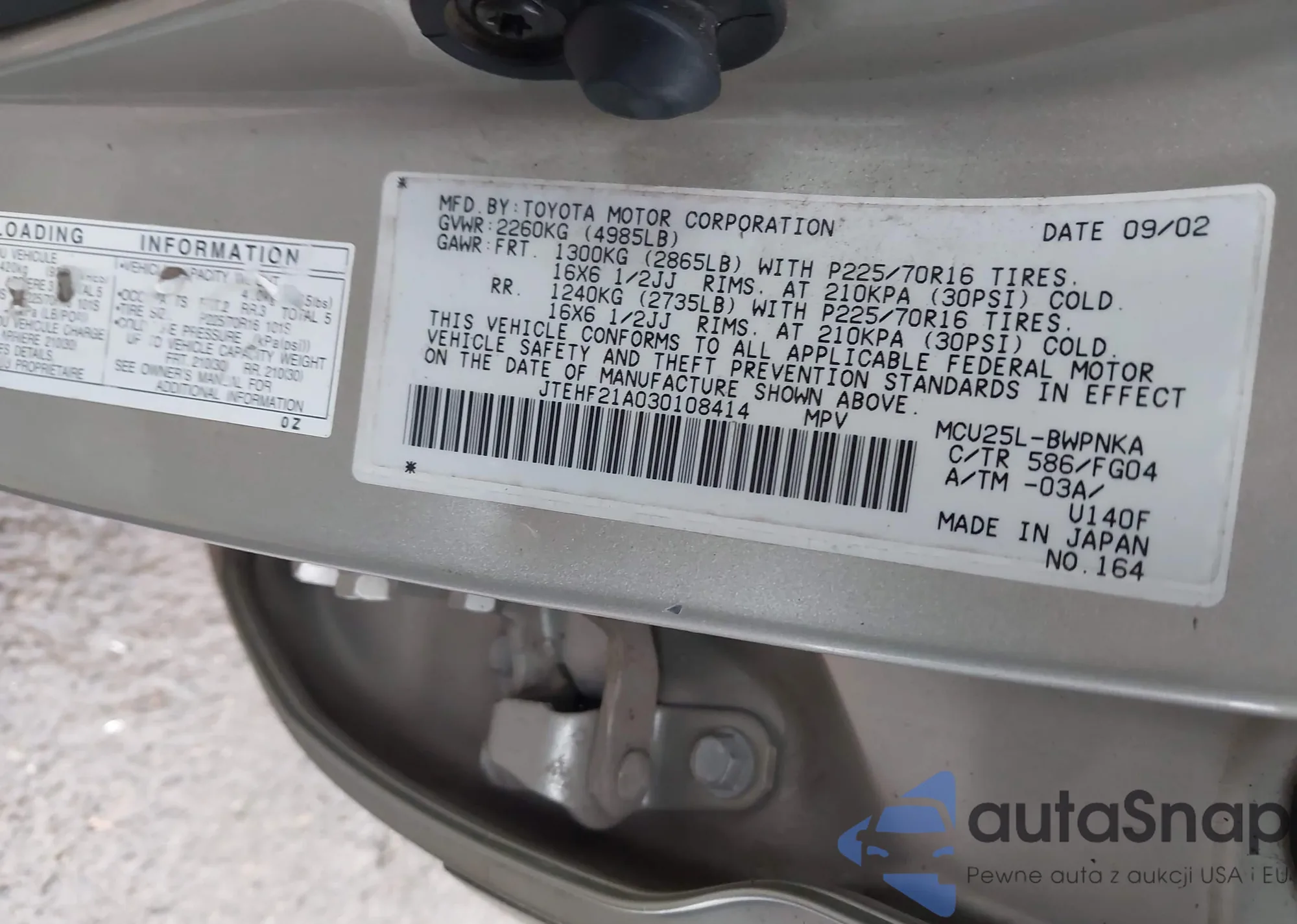 LOT: 44164924 VIN: JTEHD21A130022115