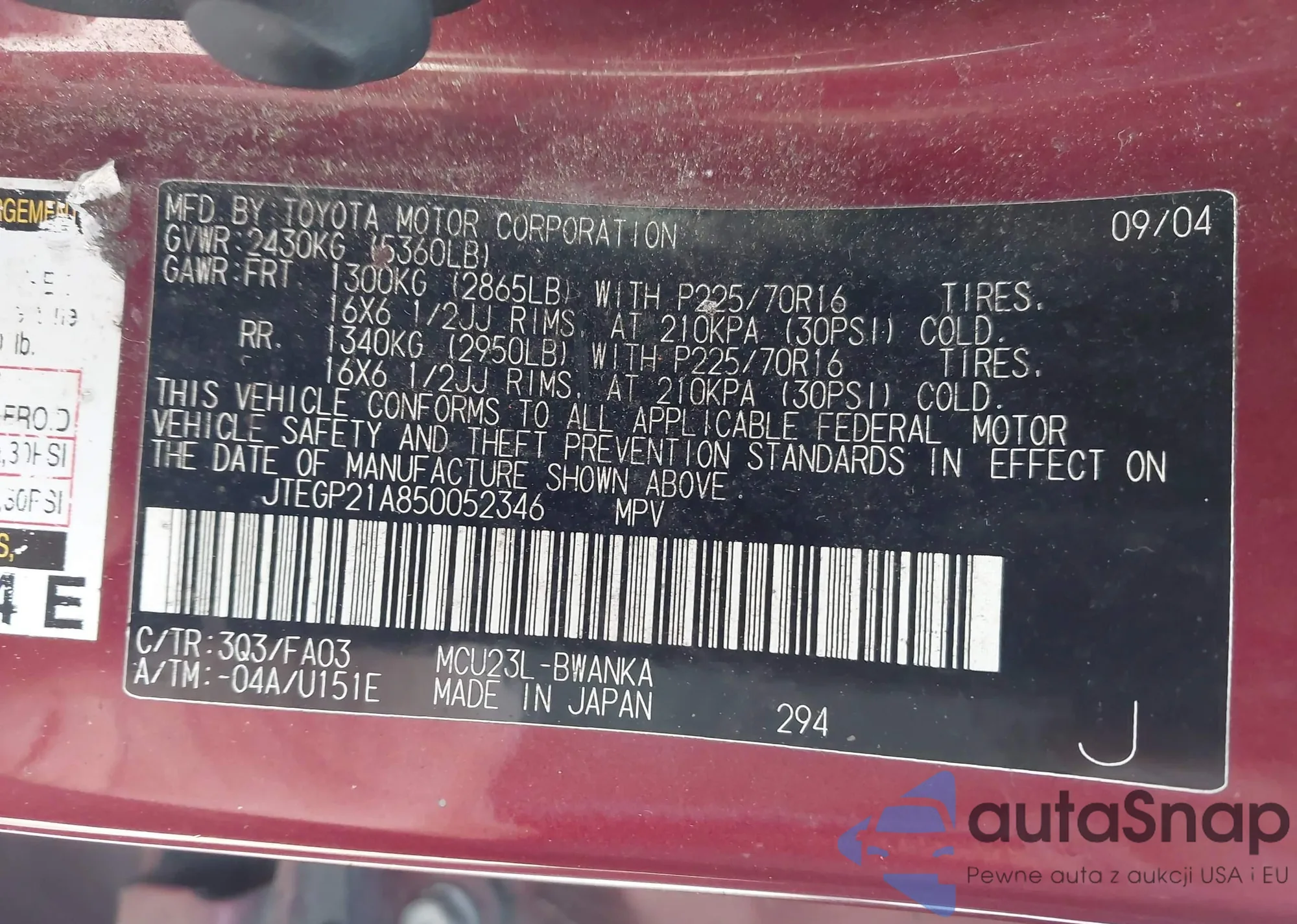 LOT: 44325514 VIN: JTEGP21A850052346