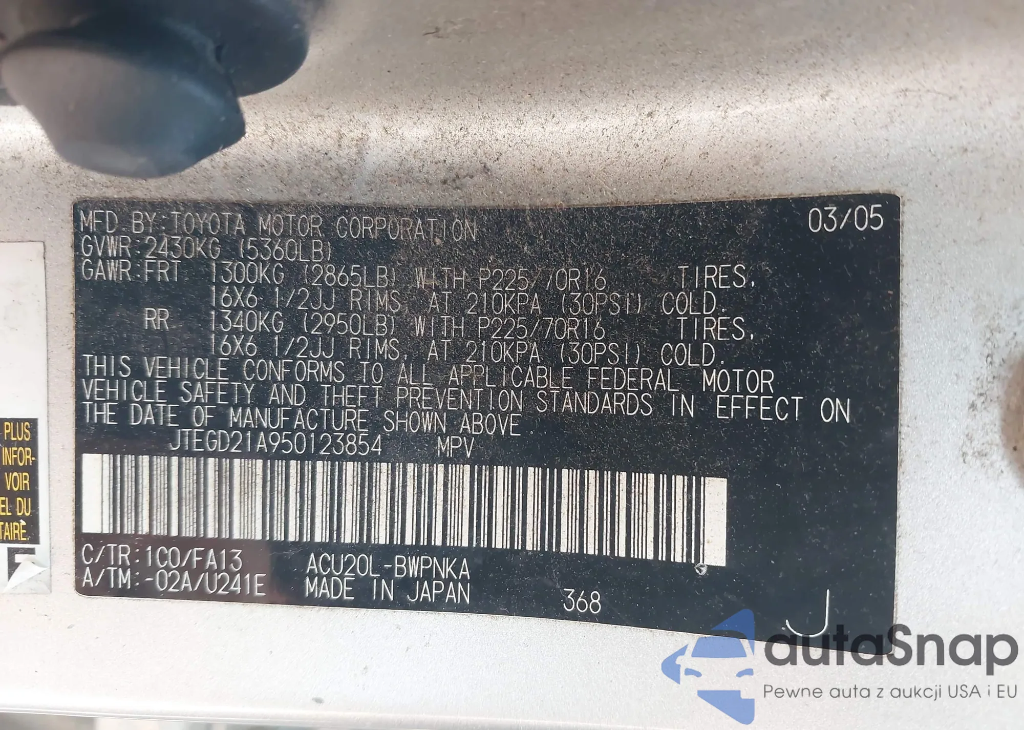 LOT: 43994970 VIN: JTEDP21A550087073