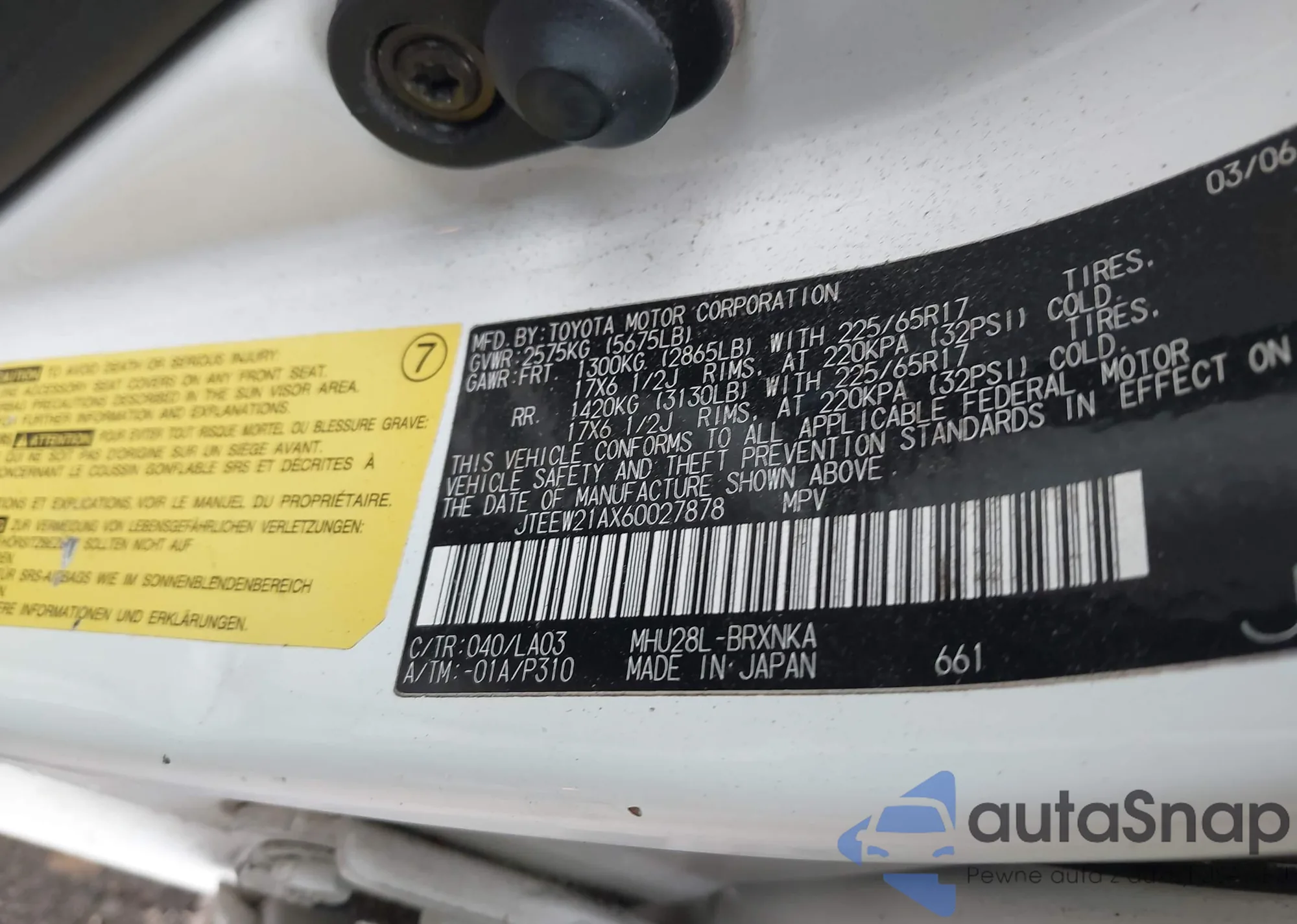 LOT: 43855928 VIN: JTEEW21AX60027878
