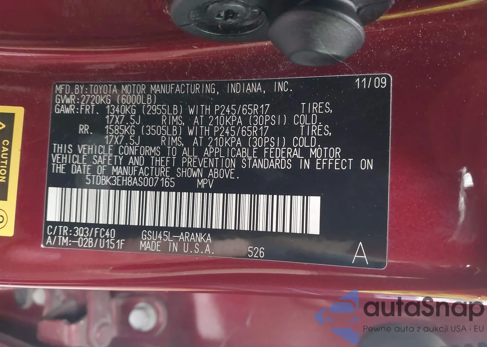 LOT: 43749005 VIN: 5TDBK3EH8AS007165
