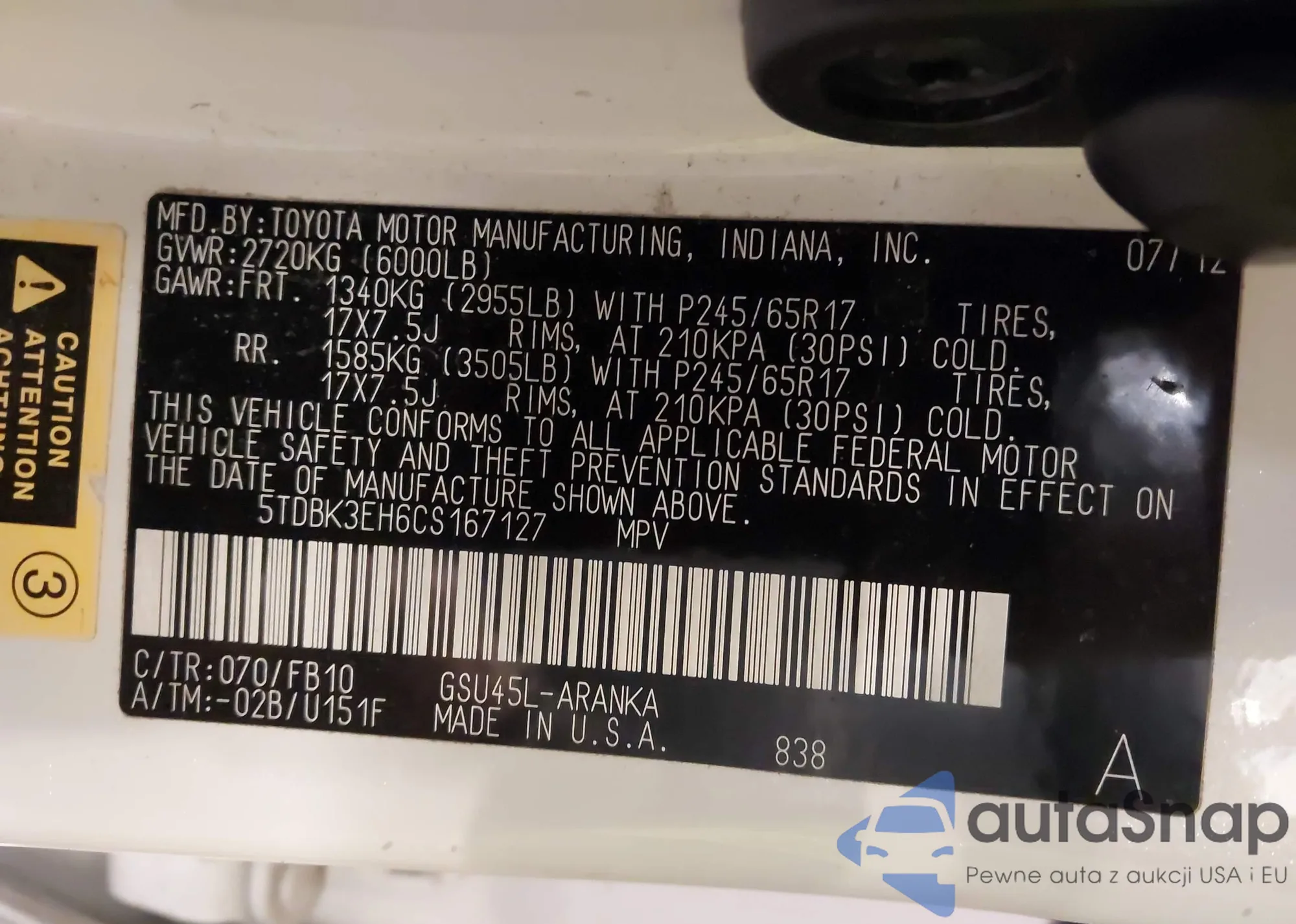 LOT: 43936696 VIN: 5TDBK3EH6CS167127