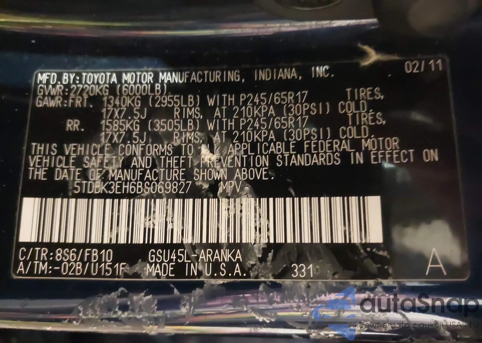 LOT: 43968089 VIN: 5TDBK3EH6BS069827