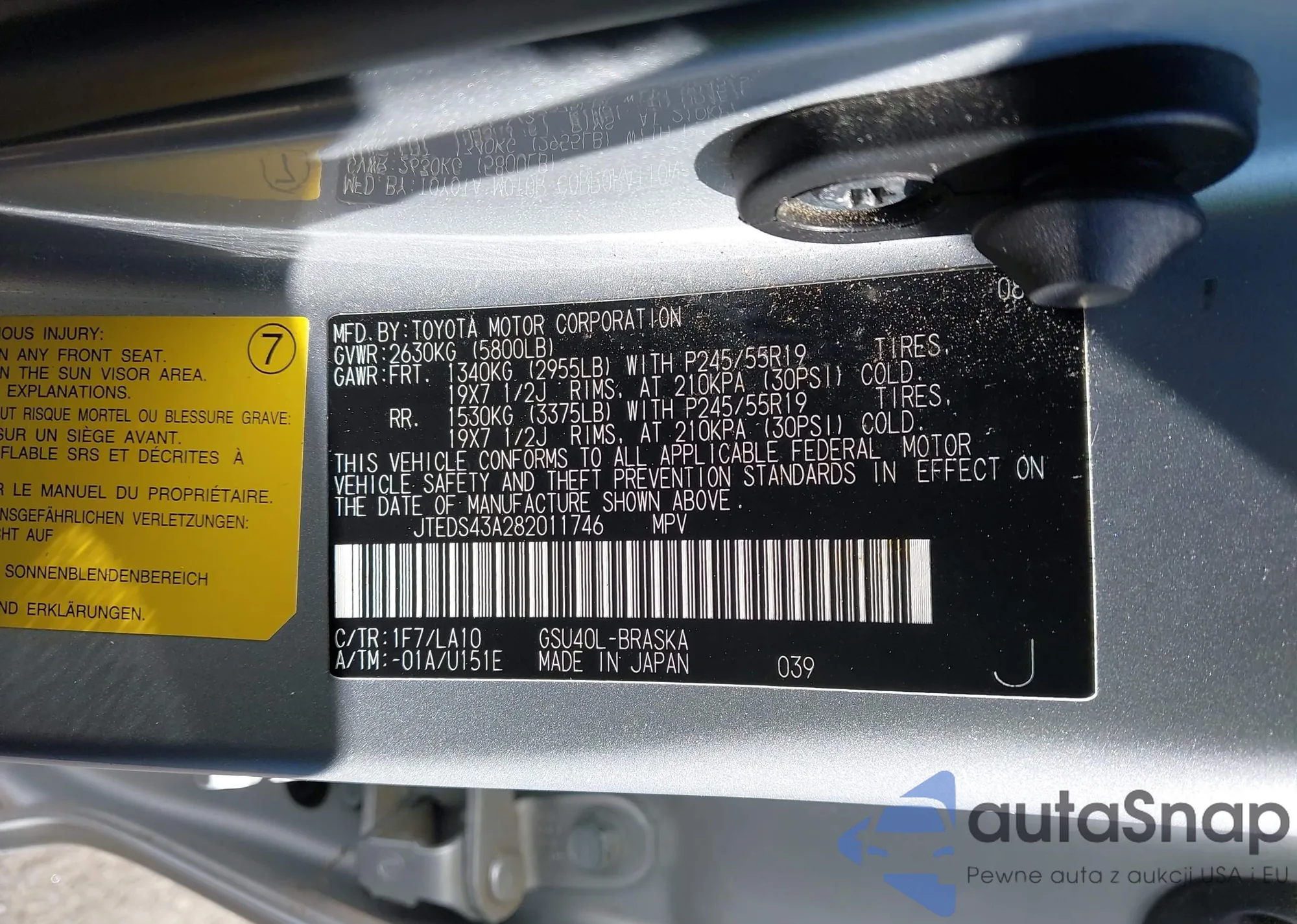 LOT: 44388587 VIN: JTEDS43A282011746