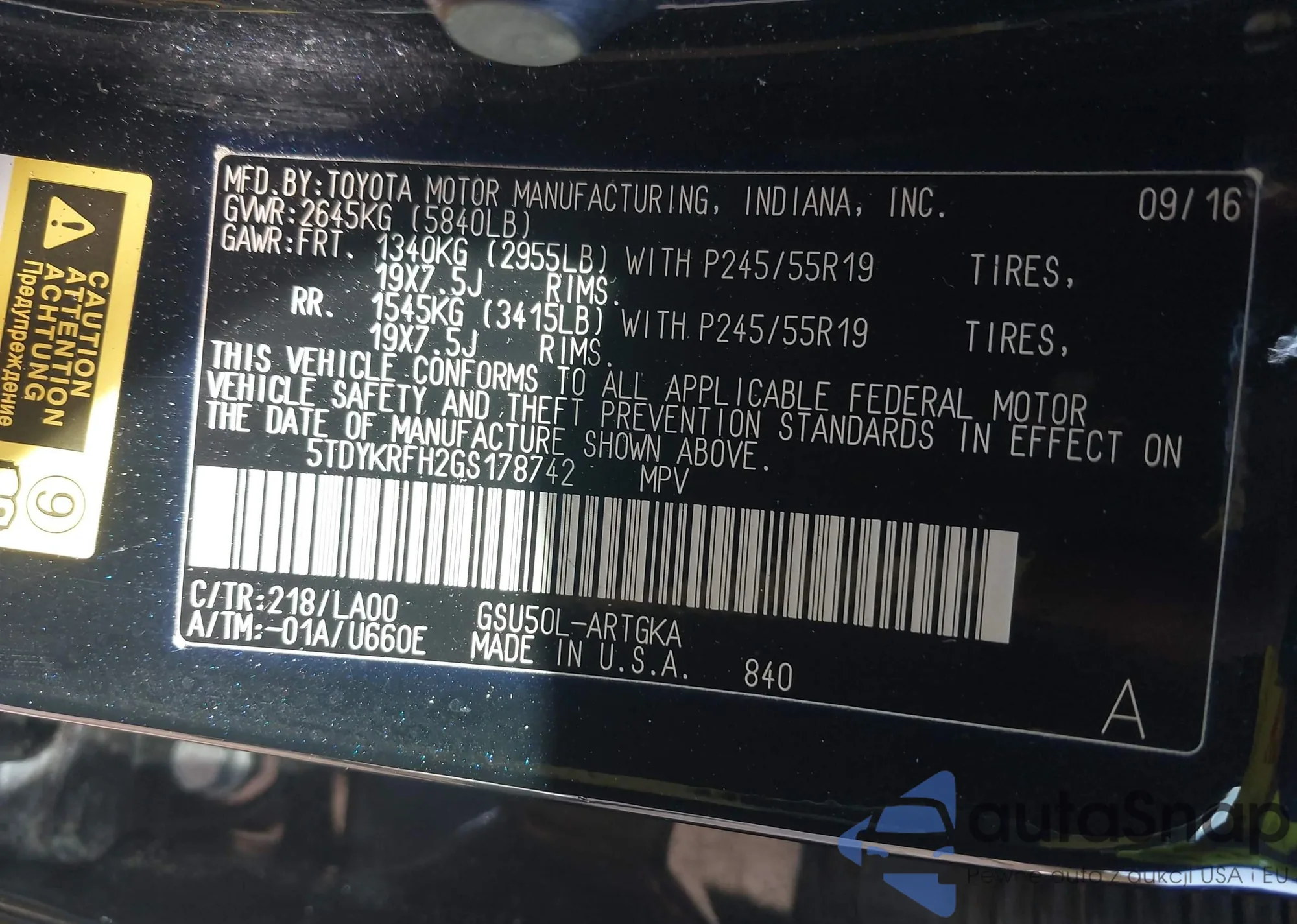 LOT: 43528594 VIN: 5TDYKRFH2GS178742