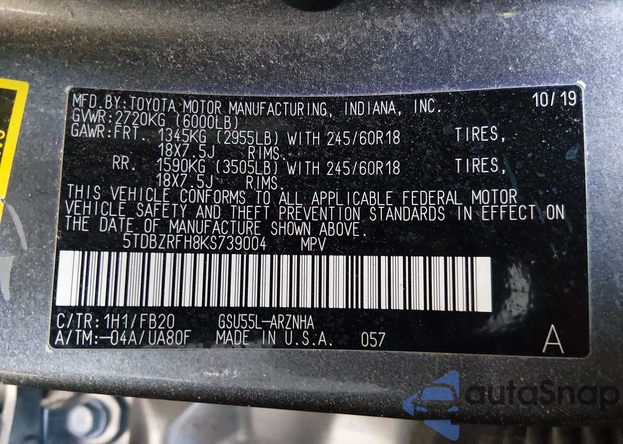 • VIN 5TDBZRFH8KS739004
