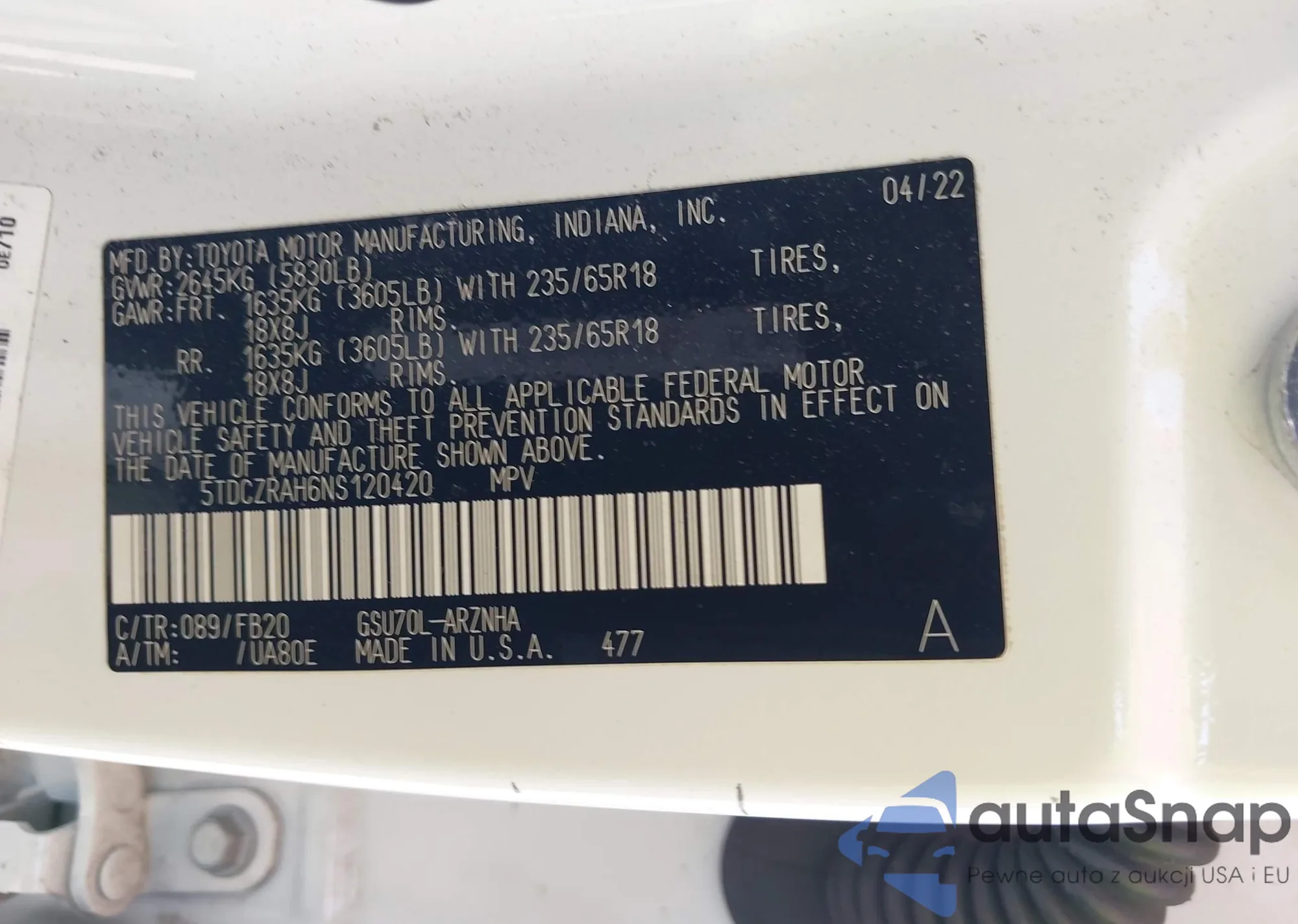 LOT: 43469260 VIN: 5TDCZRAH6NS120420