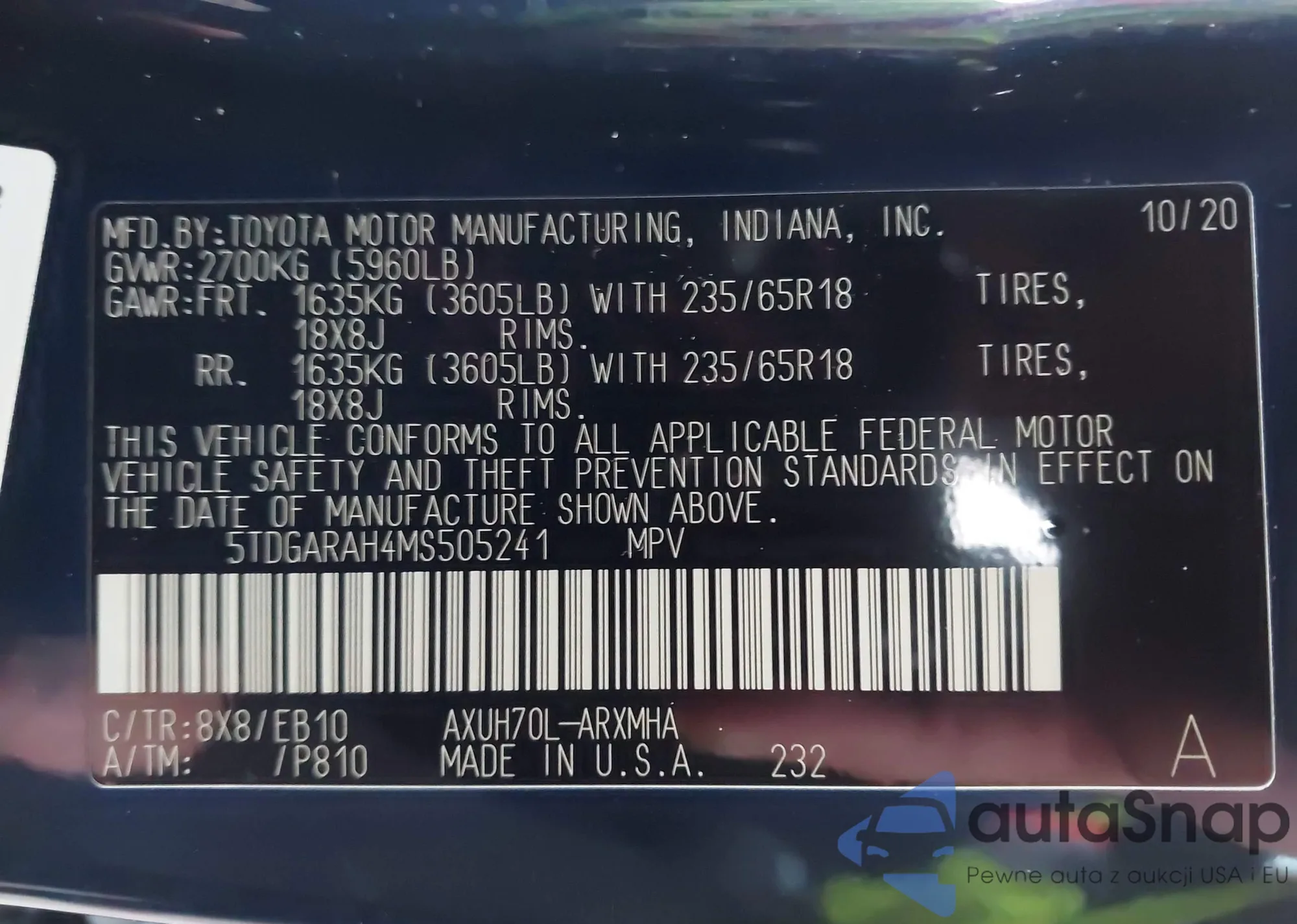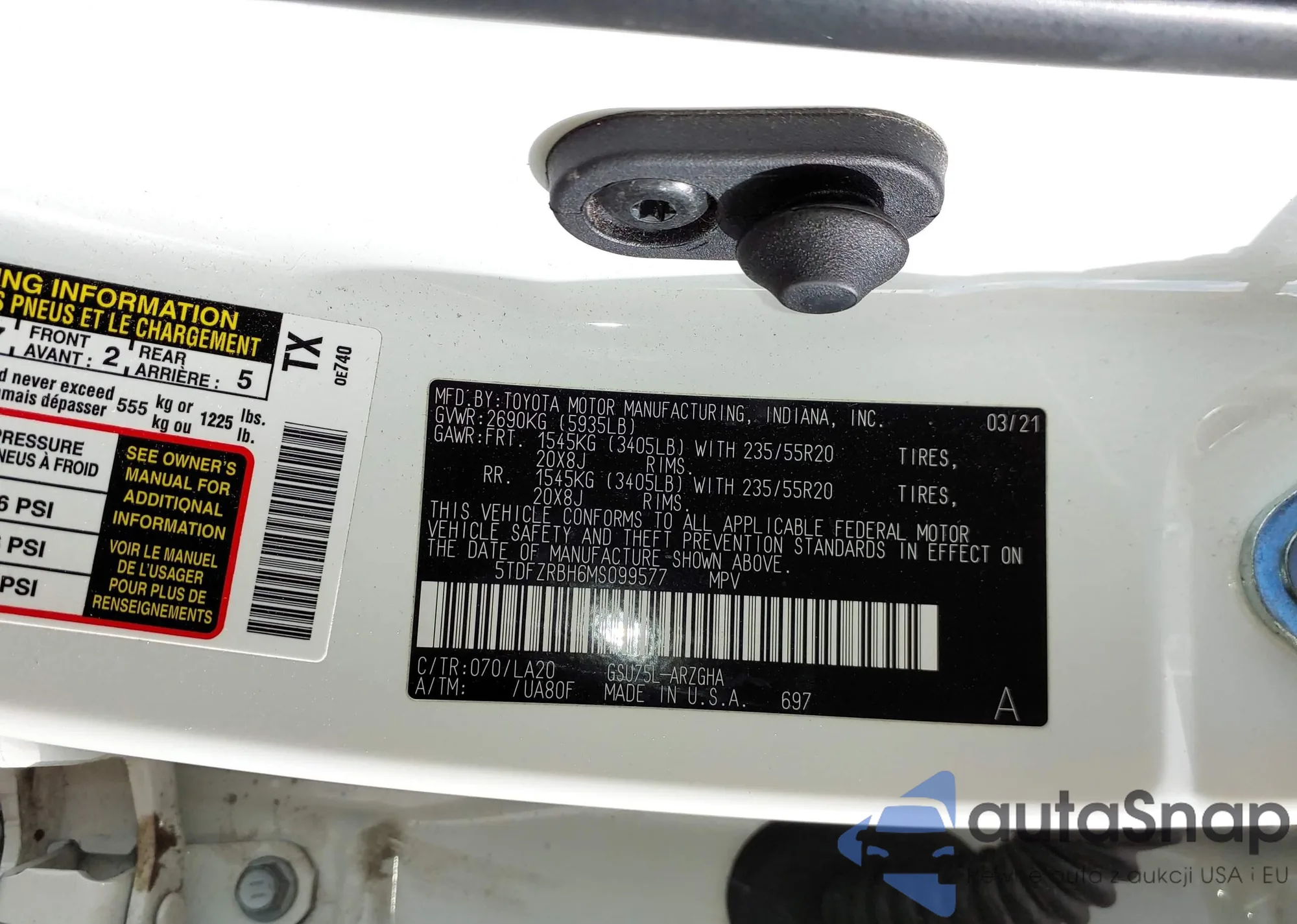 LOT: 43913799 VIN: 5TDZZRAH2MS051105