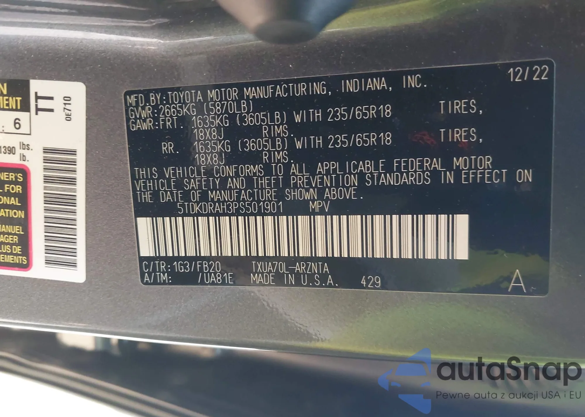 LOT: 43649619 VIN: 5TDKDRAH3PS501901
