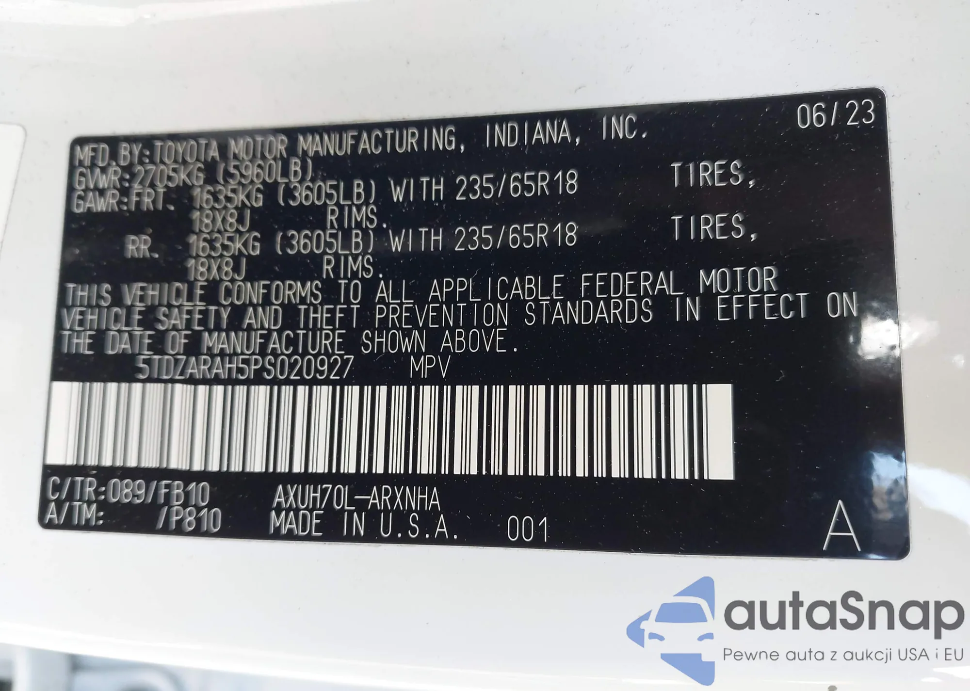 • VIN 5TDZARAH5PS020927