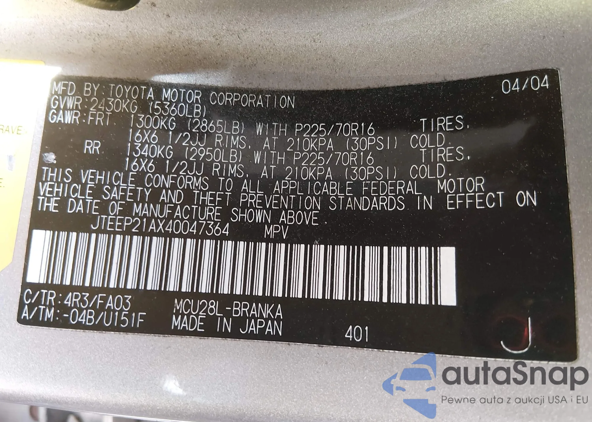 • VIN JTEEP21AX40047364