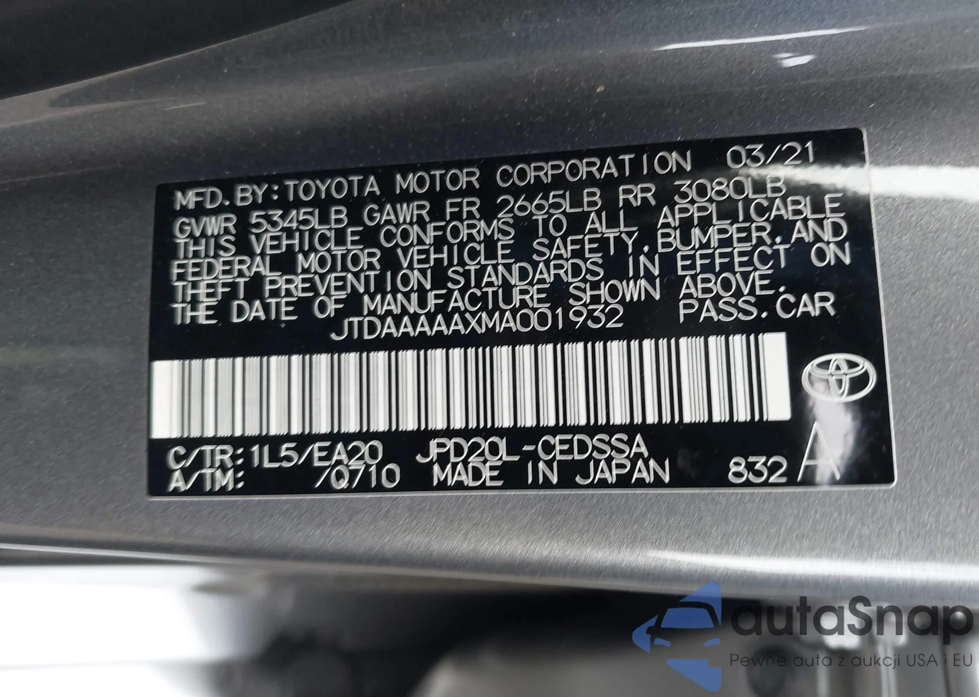 LOT: 80543985 VIN: JTDAAAAA5MA002342