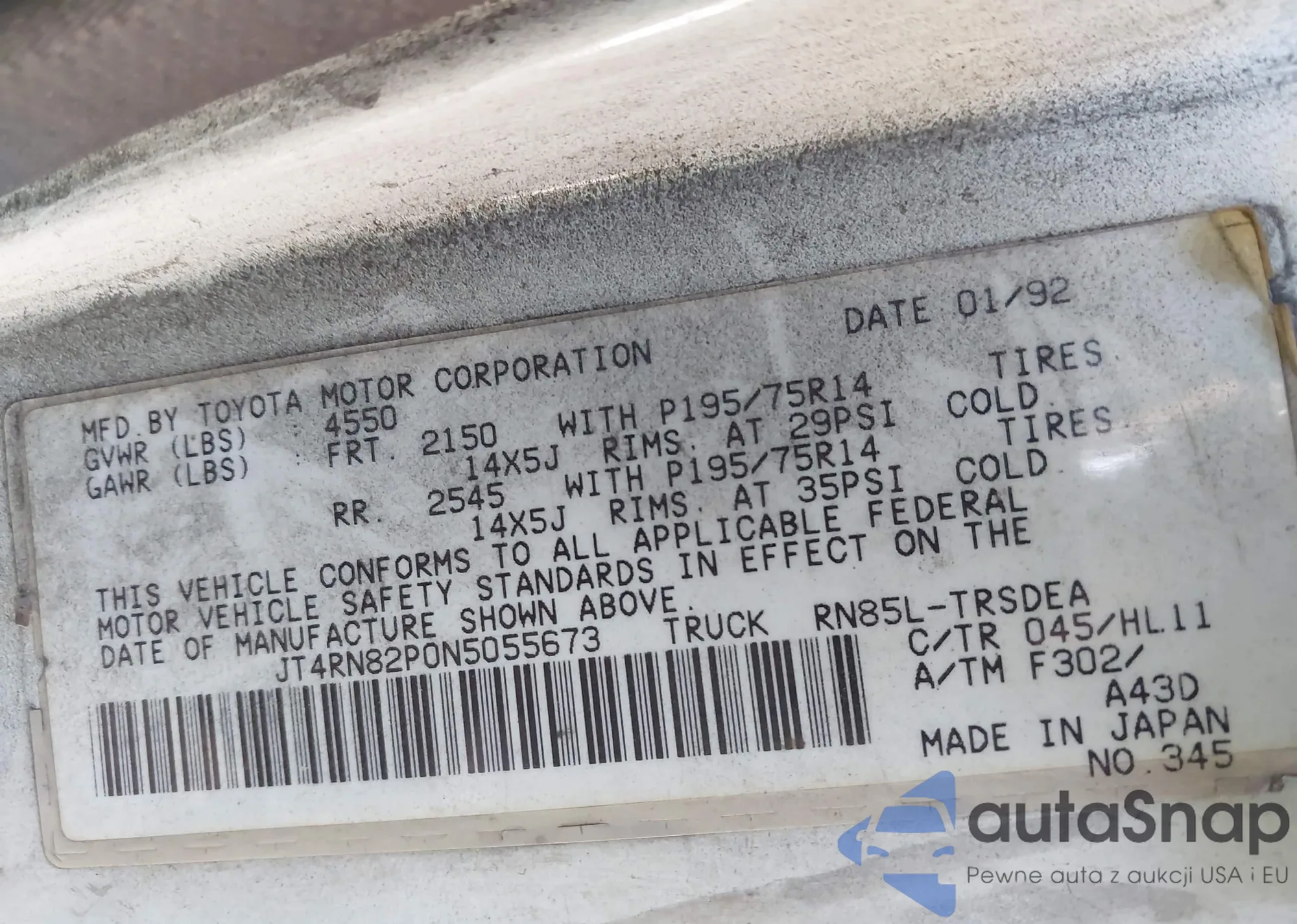LOT: 86067555 VIN: JT4RN81P2M5103836