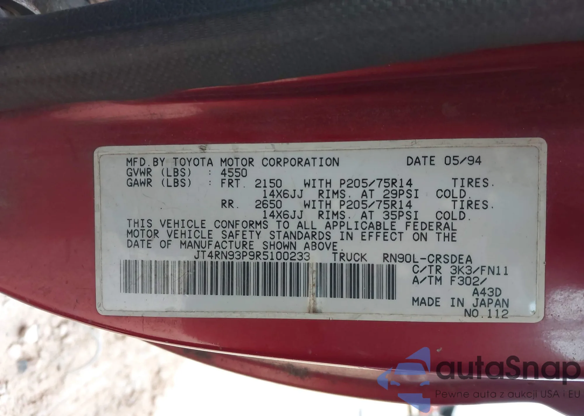 LOT: 44189480 VIN: JT4RN93P9R5100233