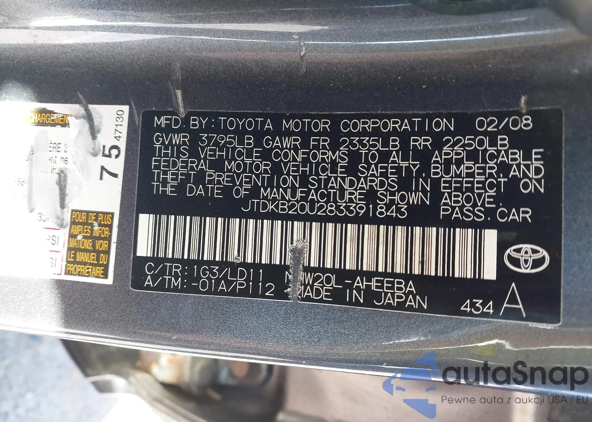 LOT: 43277289 VIN: JTDKB20U283391843