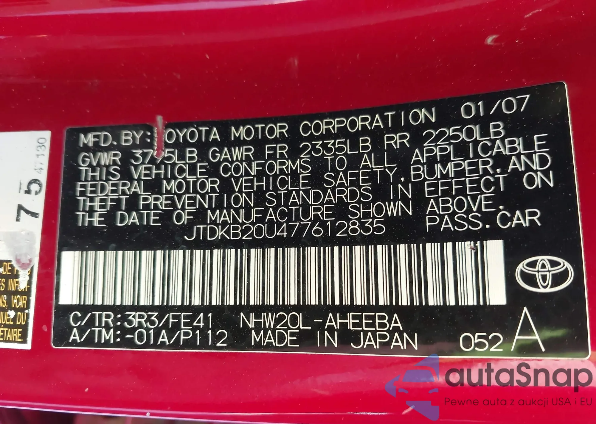 LOT: 43610269 VIN: JTDKB20U477612835