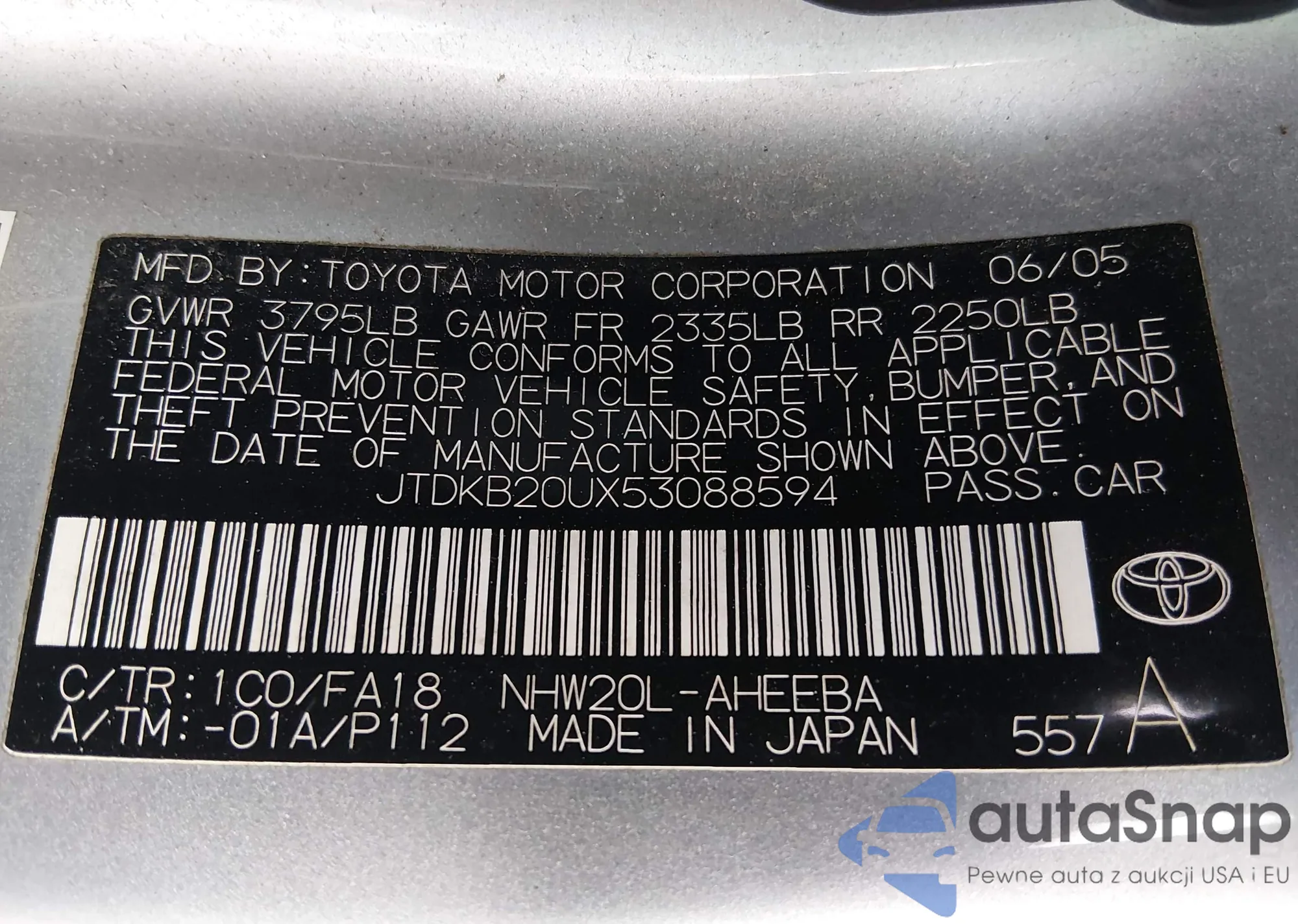 LOT: 44295502 VIN: JTDKB20U553010000