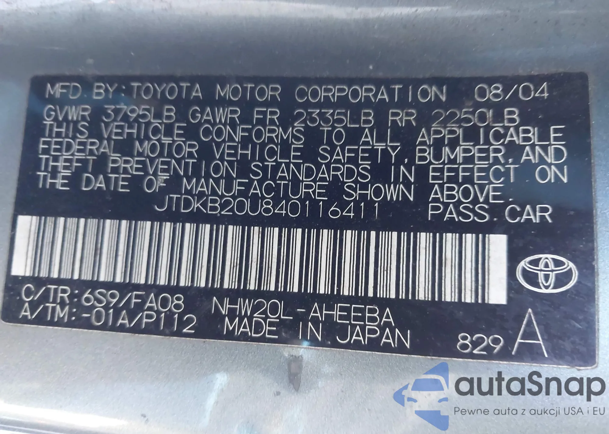 LOT: 44158241 VIN: JTDKB20U840116411