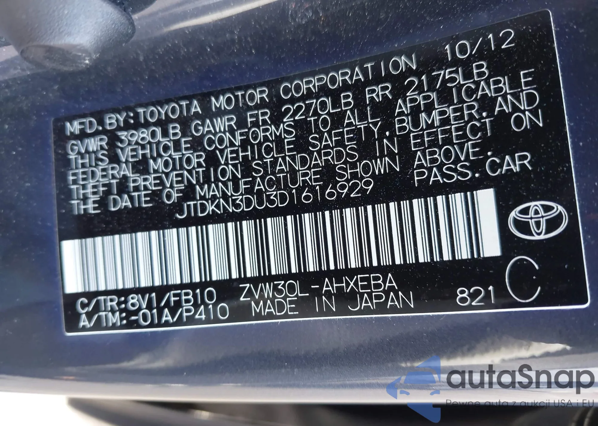 LOT: 43230563 VIN: JTDKN3DU3D1616929