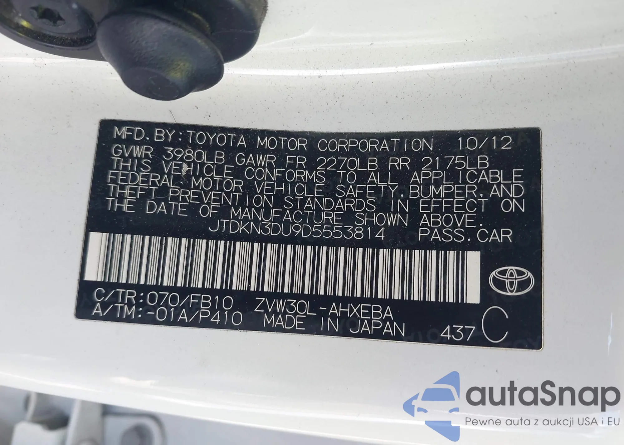 LOT: 85728895 VIN: JTDKN3DU2D5538233
