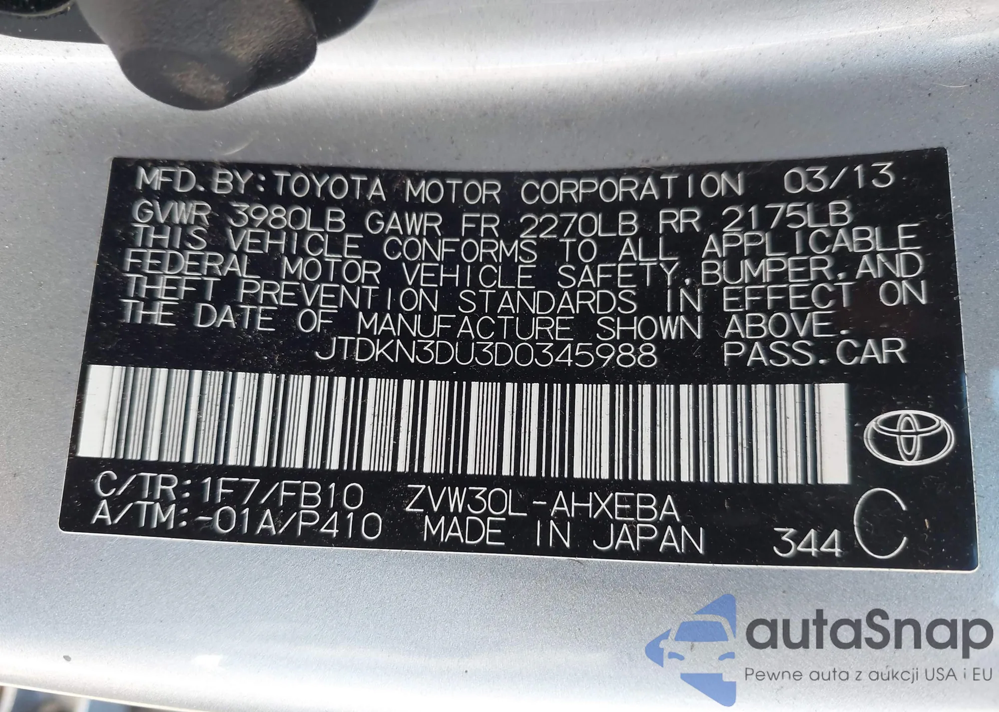 LOT: 43369689 VIN: JTDKN3DU3D0345988