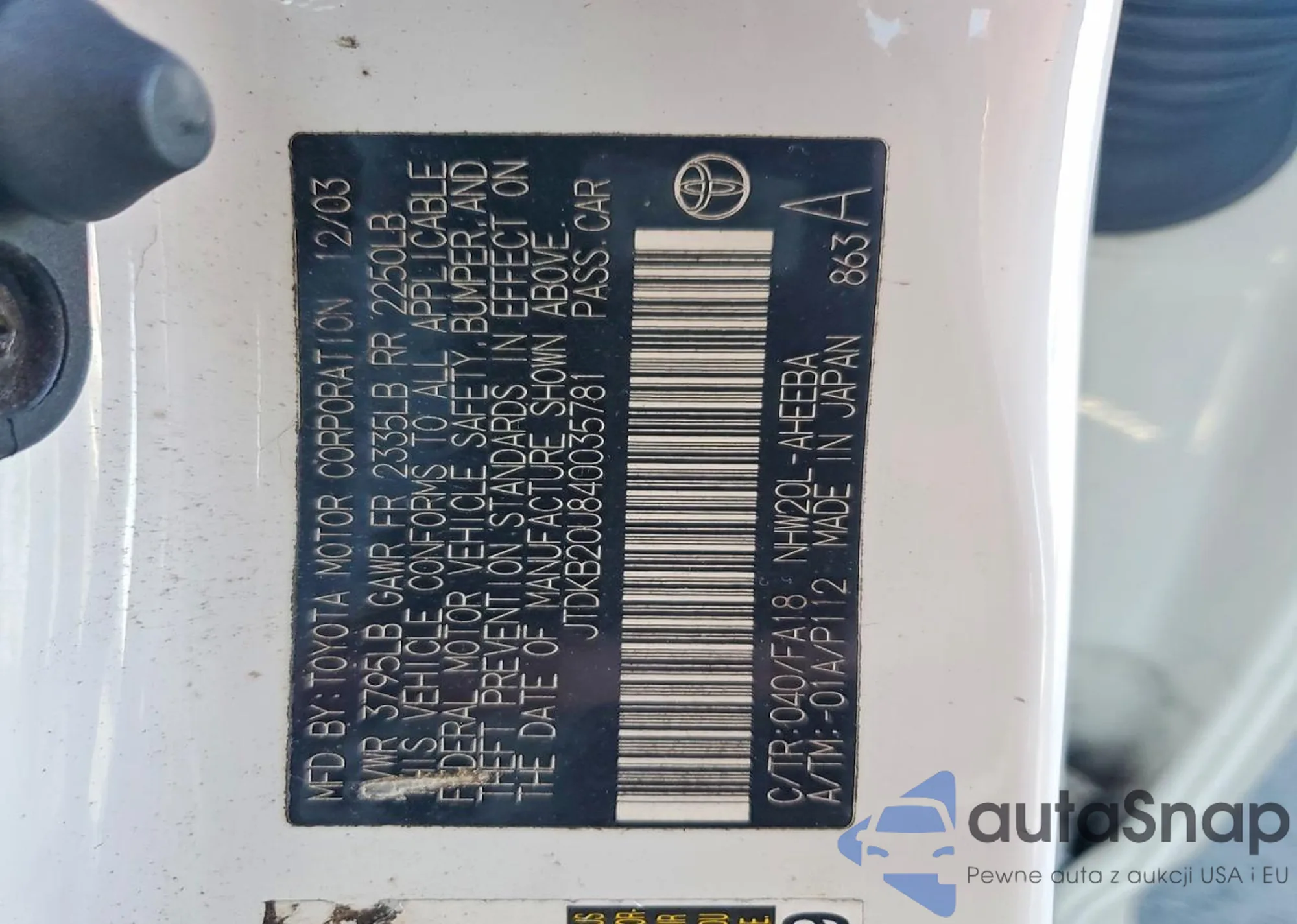LOT: 75203405 VIN: JTDKB20U840035781