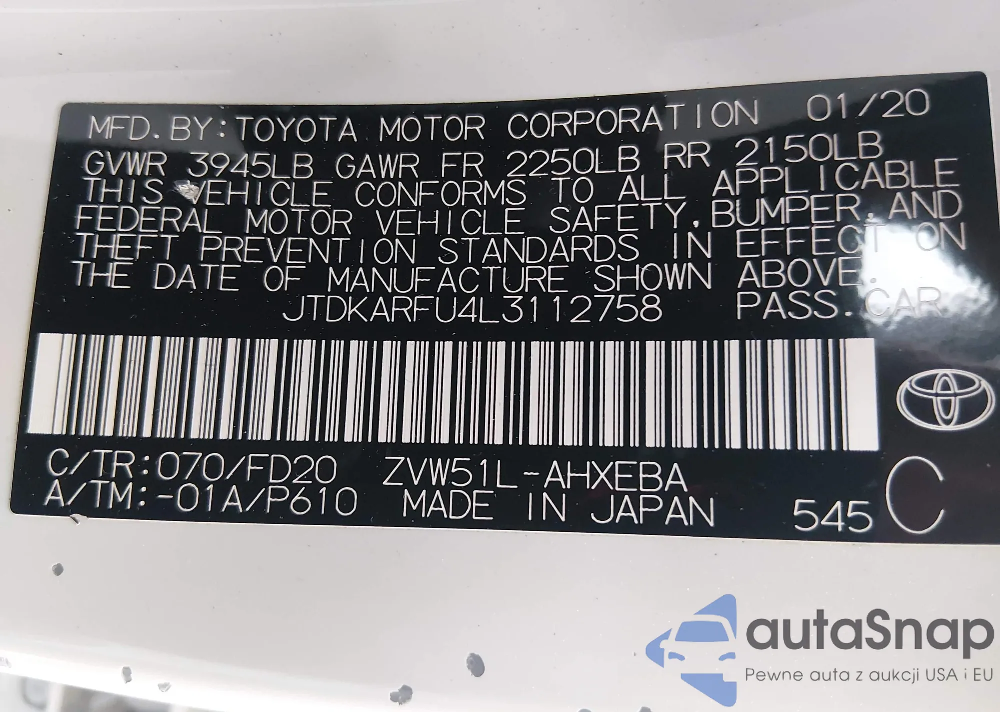 LOT: 44363675 VIN: JTDKARFU4L3112758