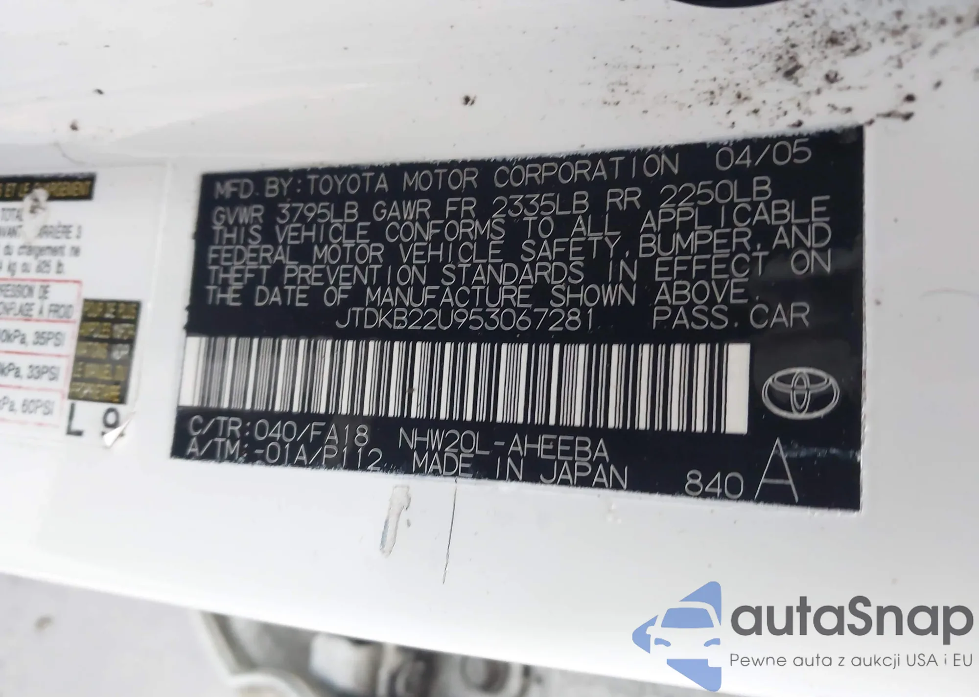 LOT: 44384734 VIN: JTDKB22U953067281