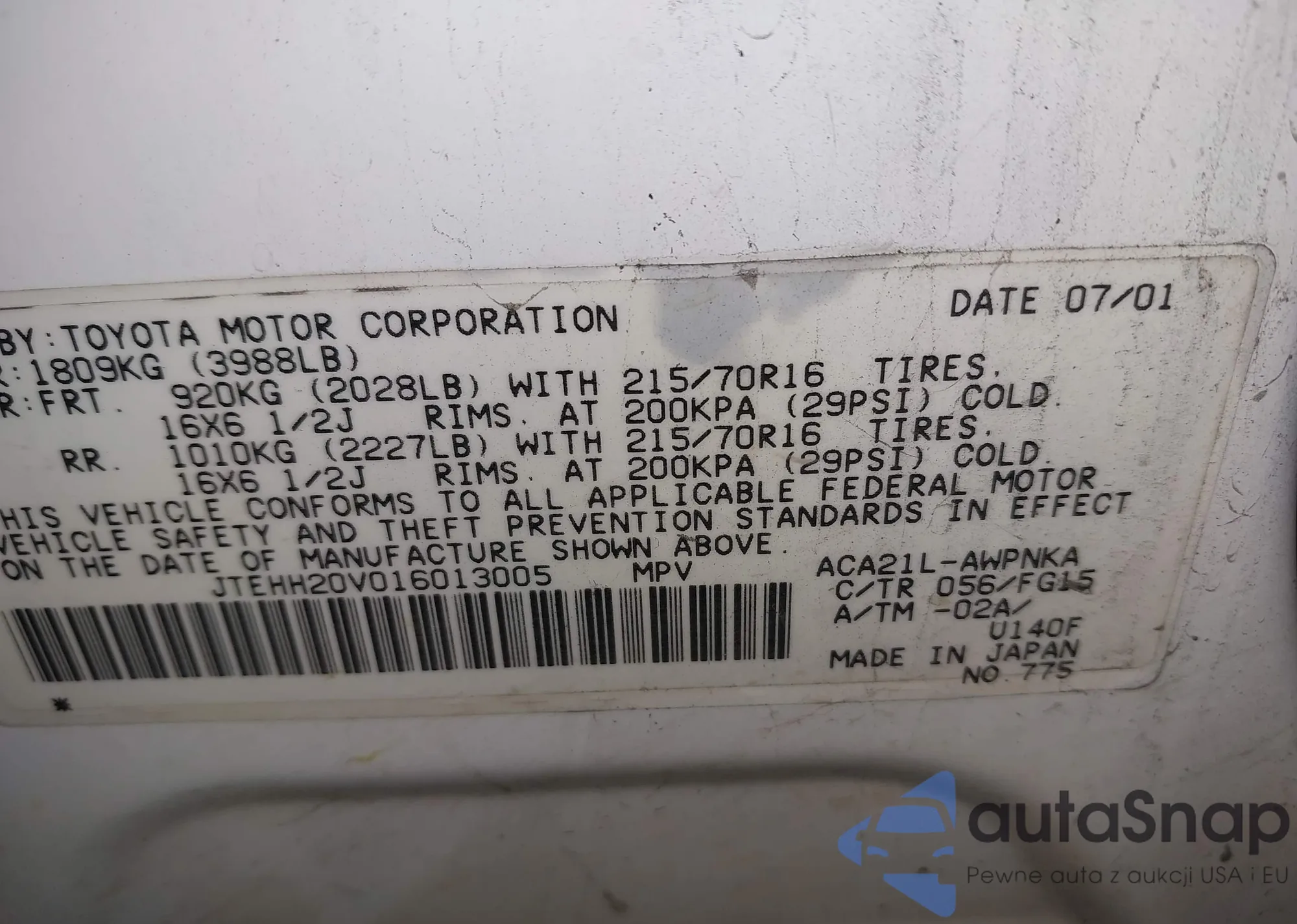 • VIN JTEHH20V016013005