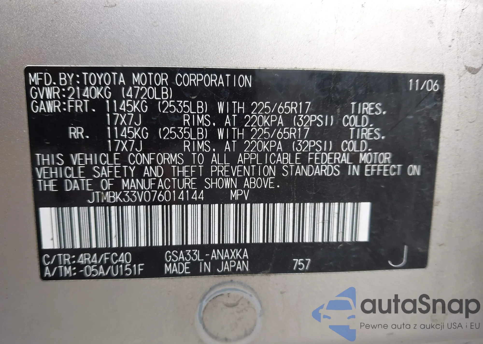 LOT: 44470283 VIN: JTMBK33V076014144