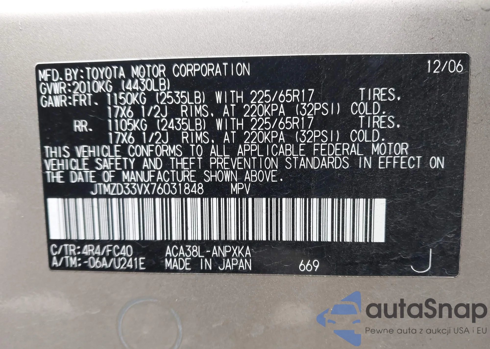 • VIN JTMZD33VX76031848
