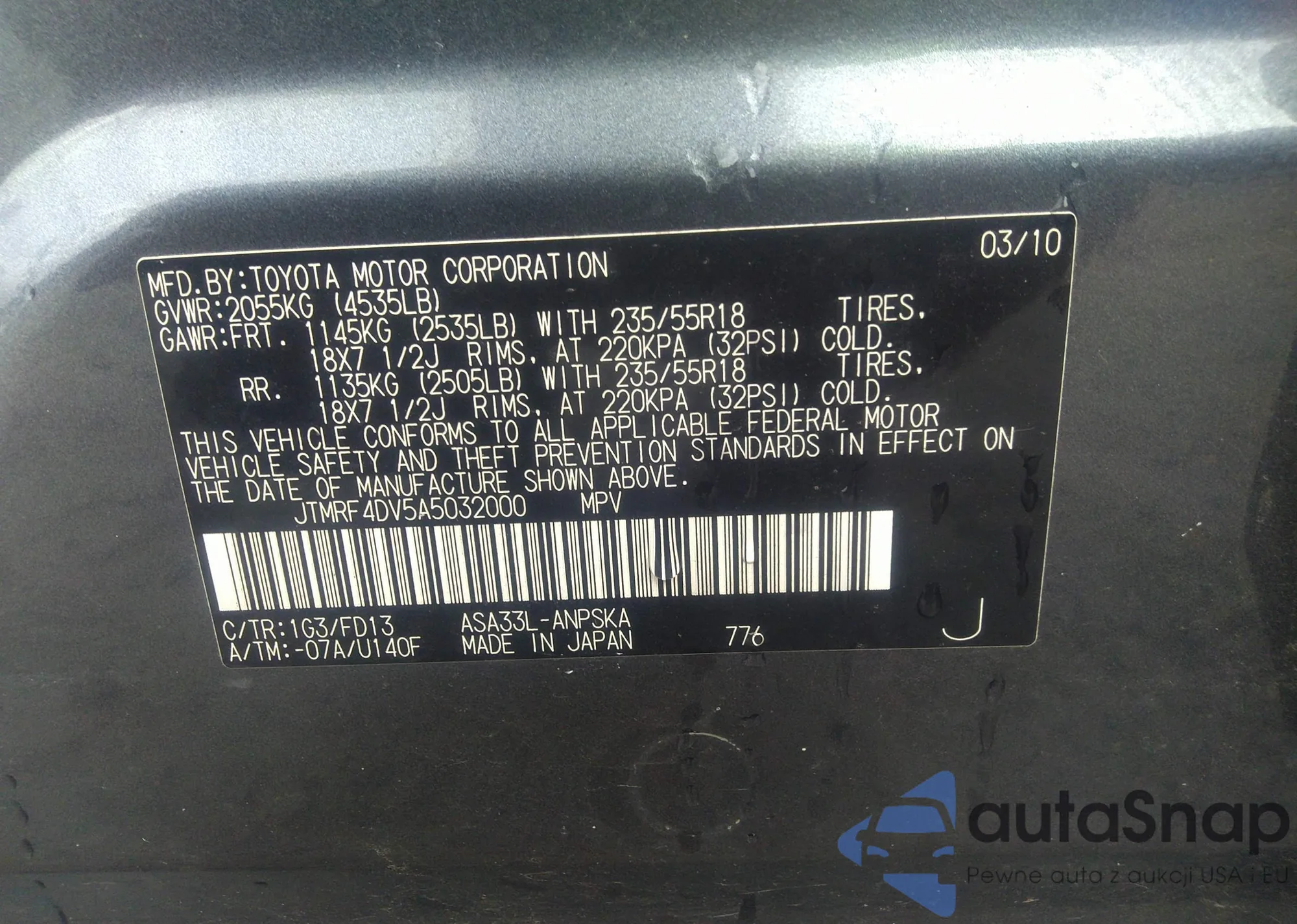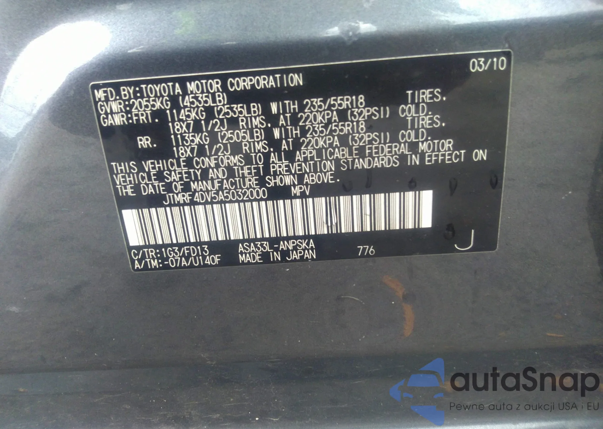 LOT: 33357087 VIN: JTMRF4DV5A5032000