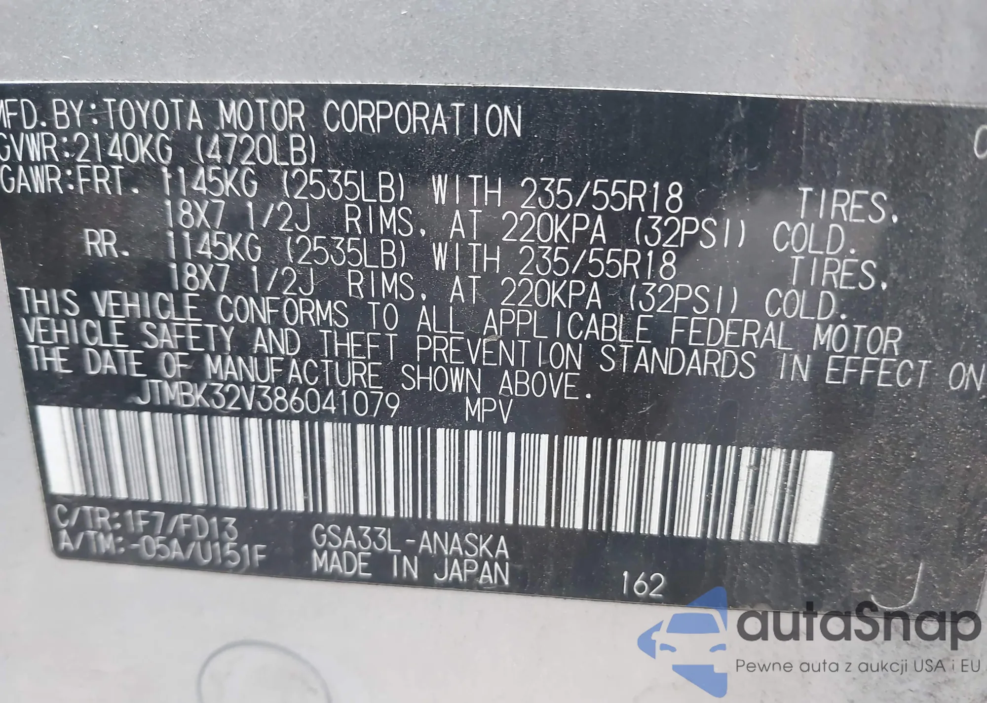 LOT: 43506105 VIN: JTMBK32V386041079