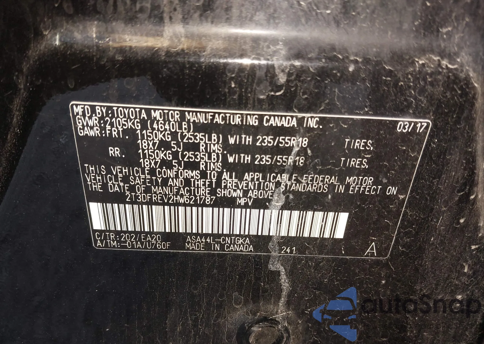 • VIN 2T3DFREV2HW621787
