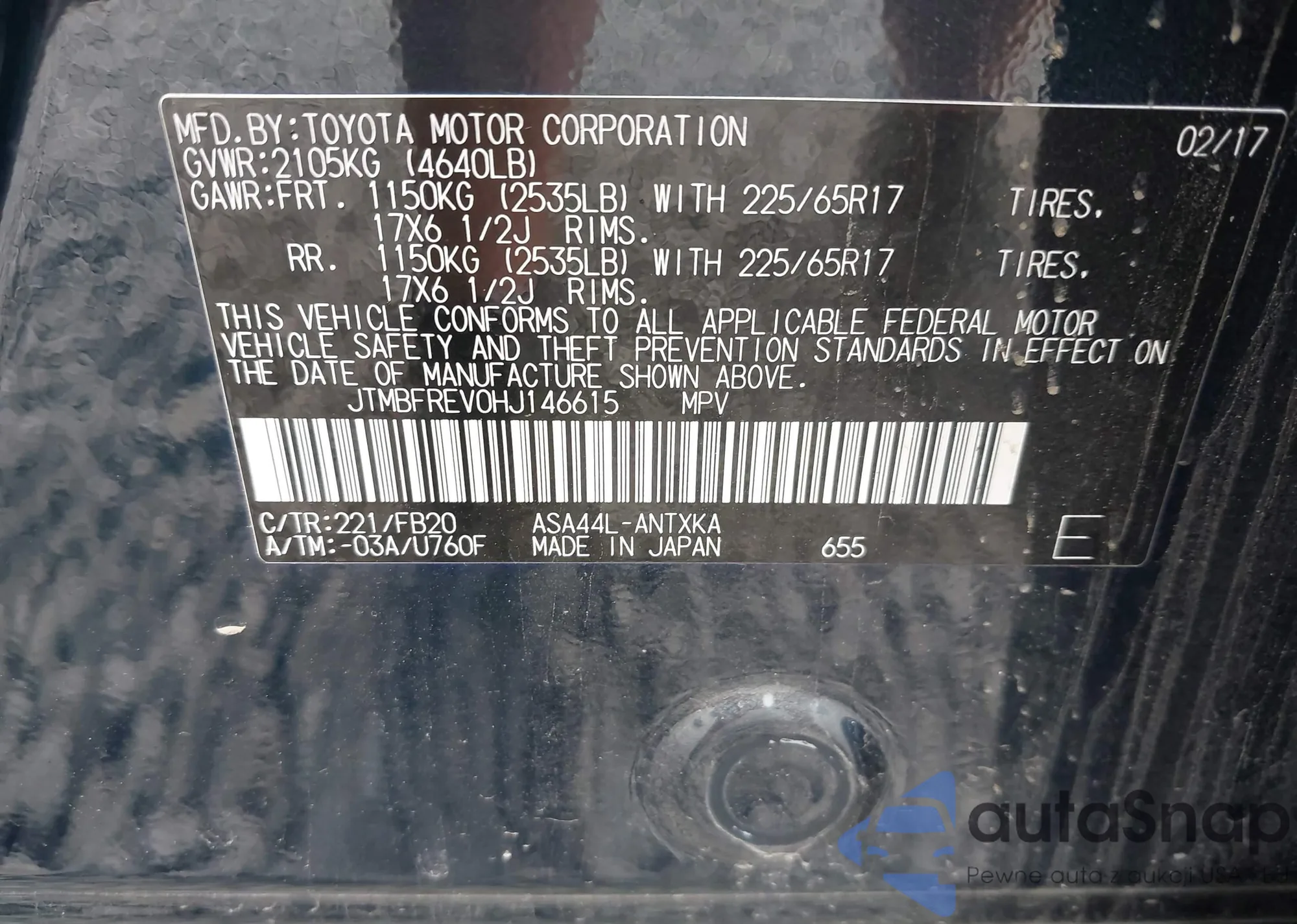 LOT: 72801135 VIN: JTMRFREV2HD204379