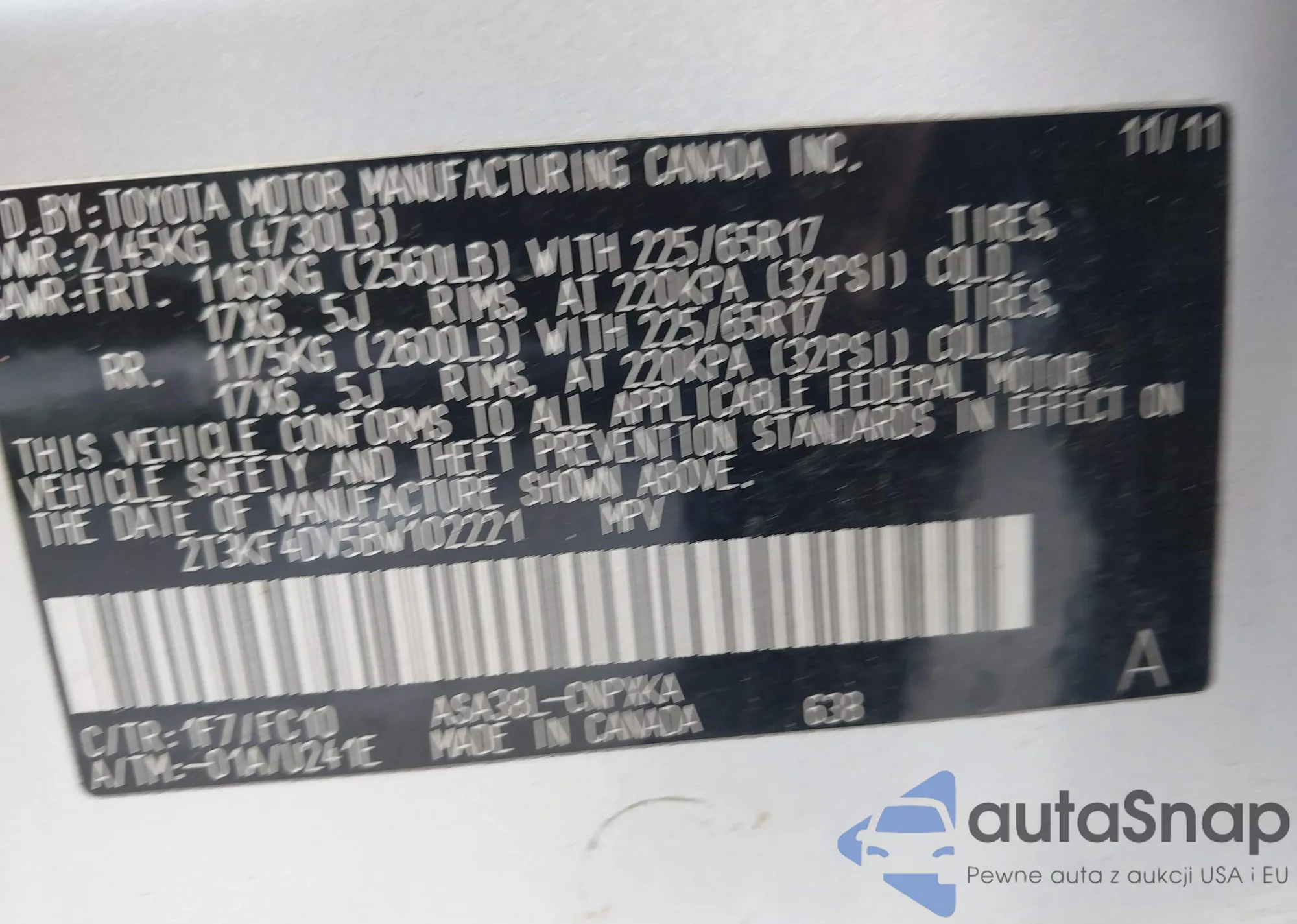 • VIN 2T3KF4DV5BW102221
