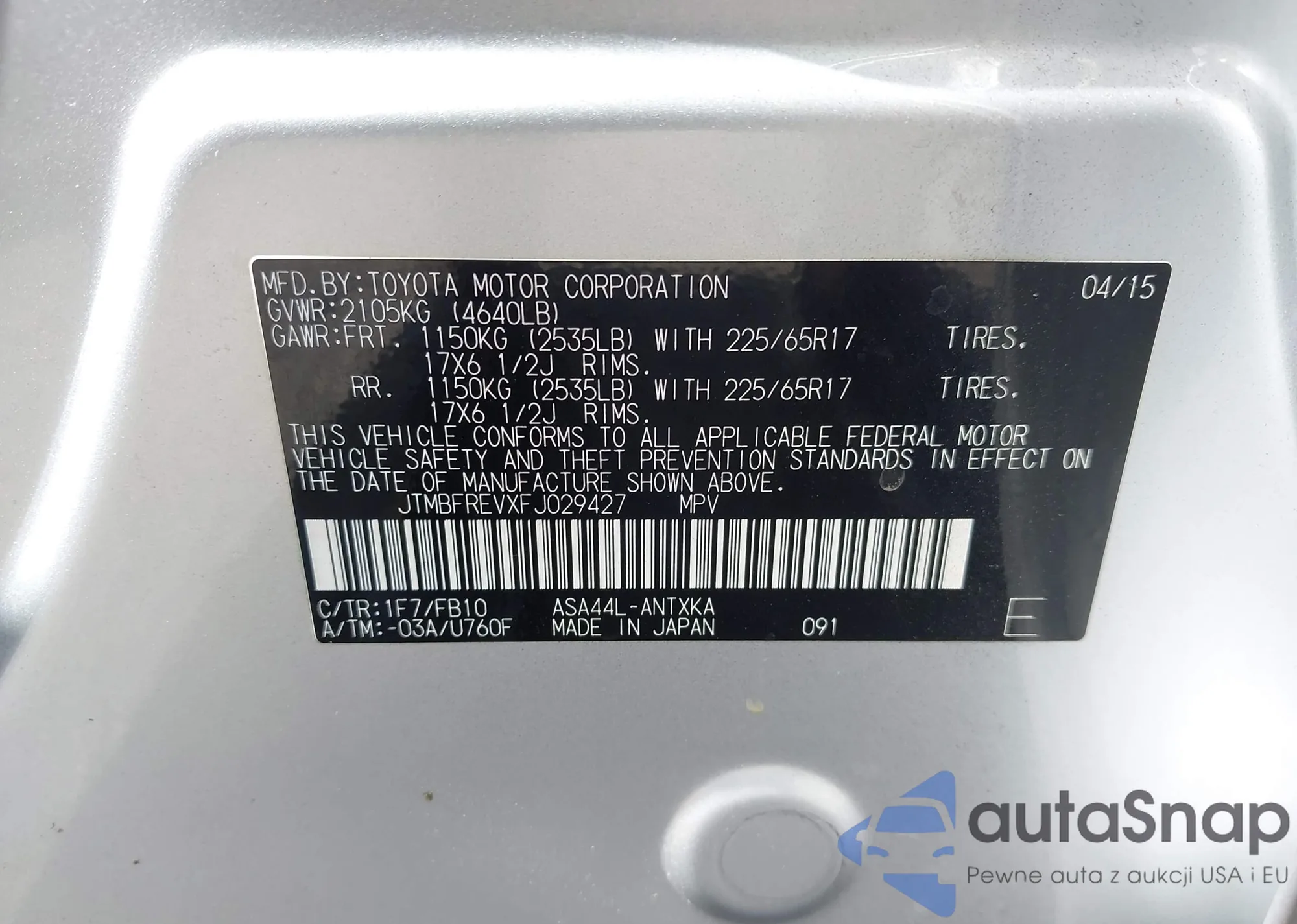 LOT: 43873244 VIN: JTMBFREVXFJ029427