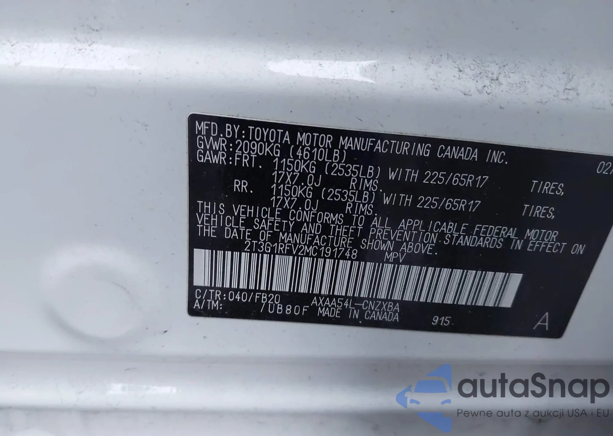 LOT: 44082167 VIN: 2T3G1RFV2MC191748