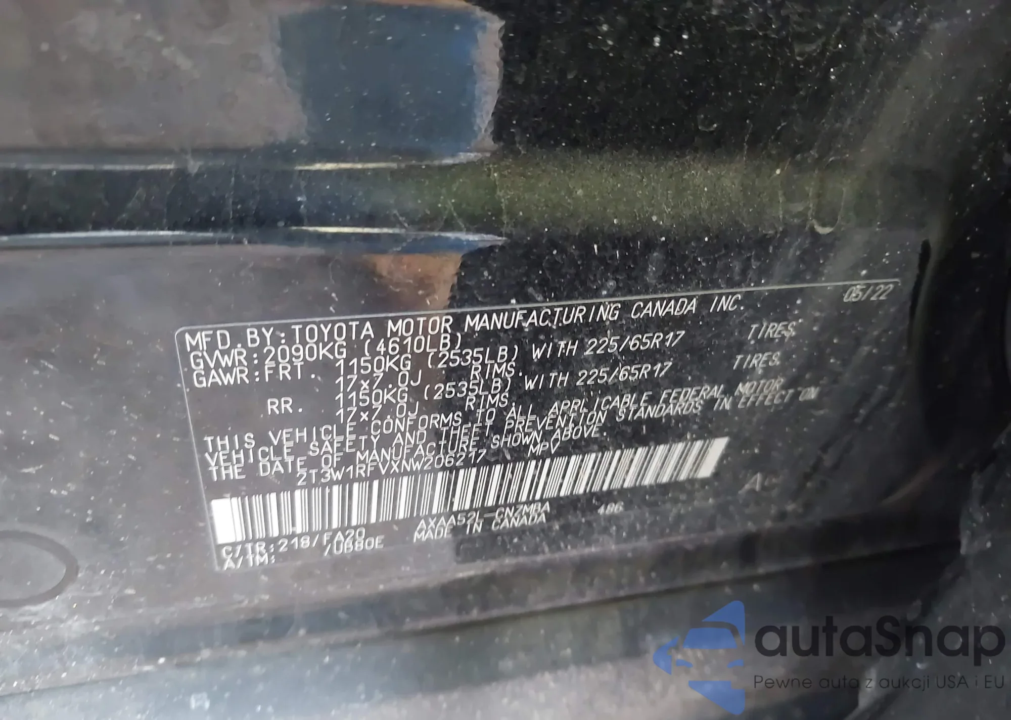 LOT: 43963815 VIN: 2T3W1RFVXNW206217