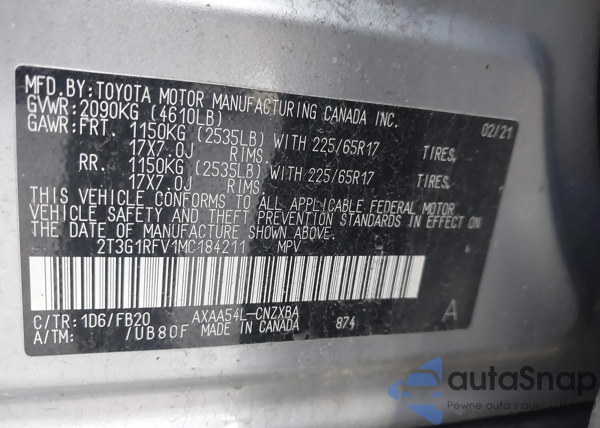 LOT: 44593634 VIN: 2T3G1RFV1MC184211