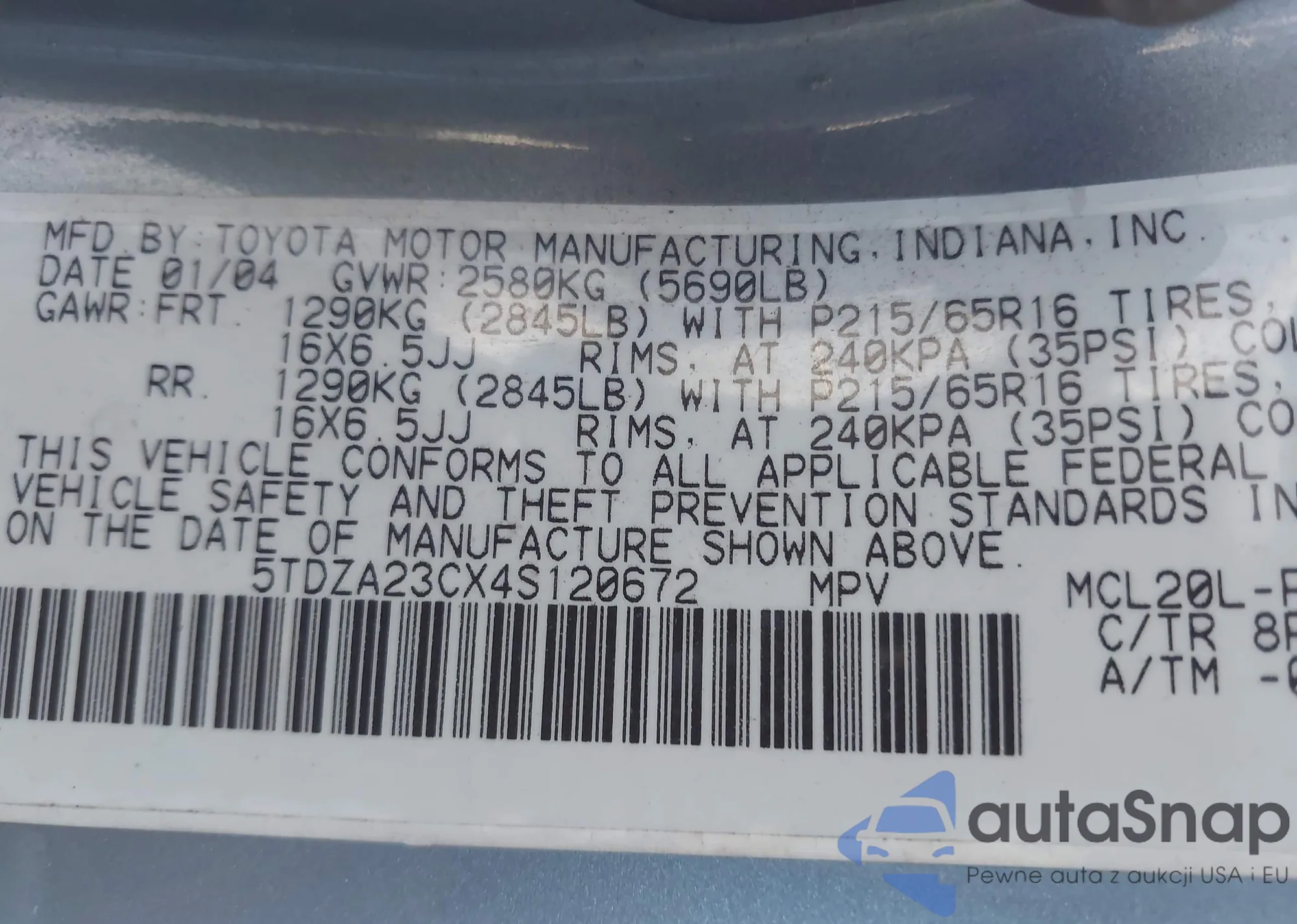 • VIN 5TDZA23CX4S120672