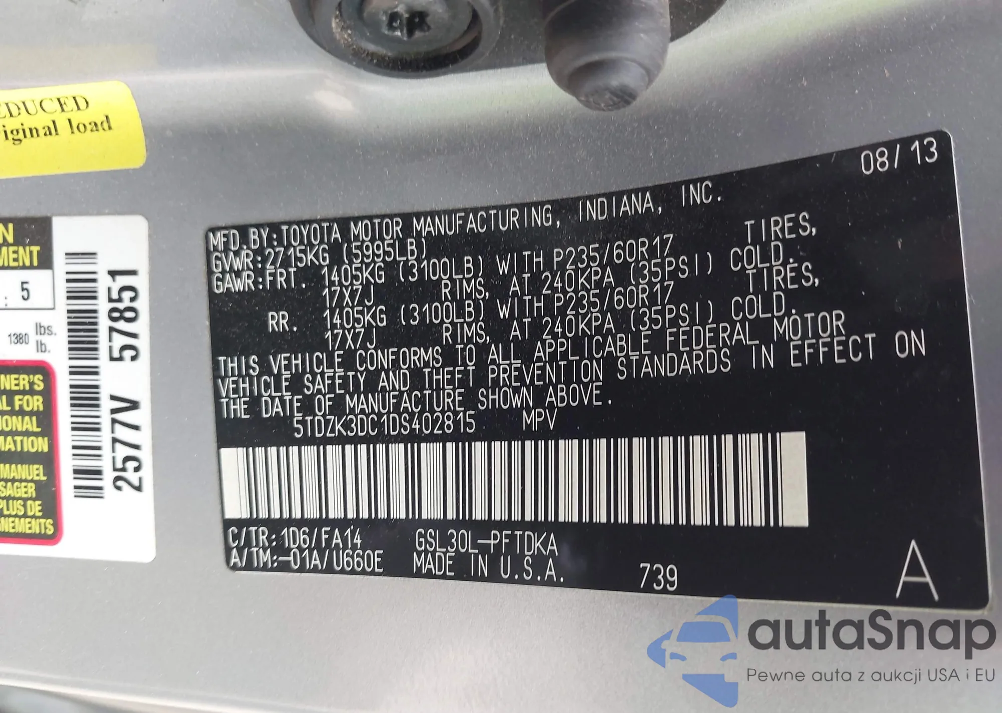 LOT: 43496212 VIN: 5TDZK3DC1DS402815