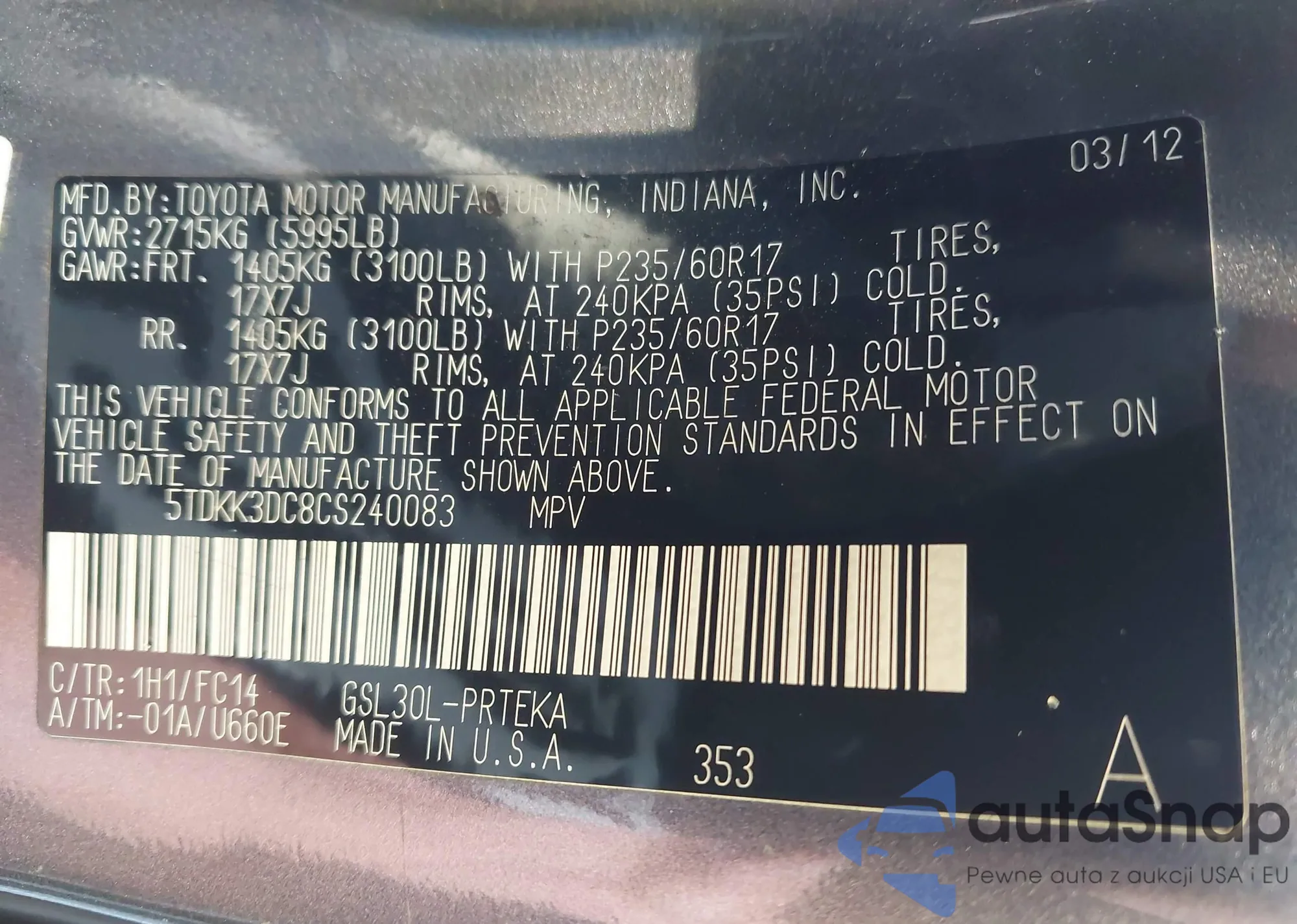 LOT: 43556901 VIN: 5TDKK3DC8CS240083
