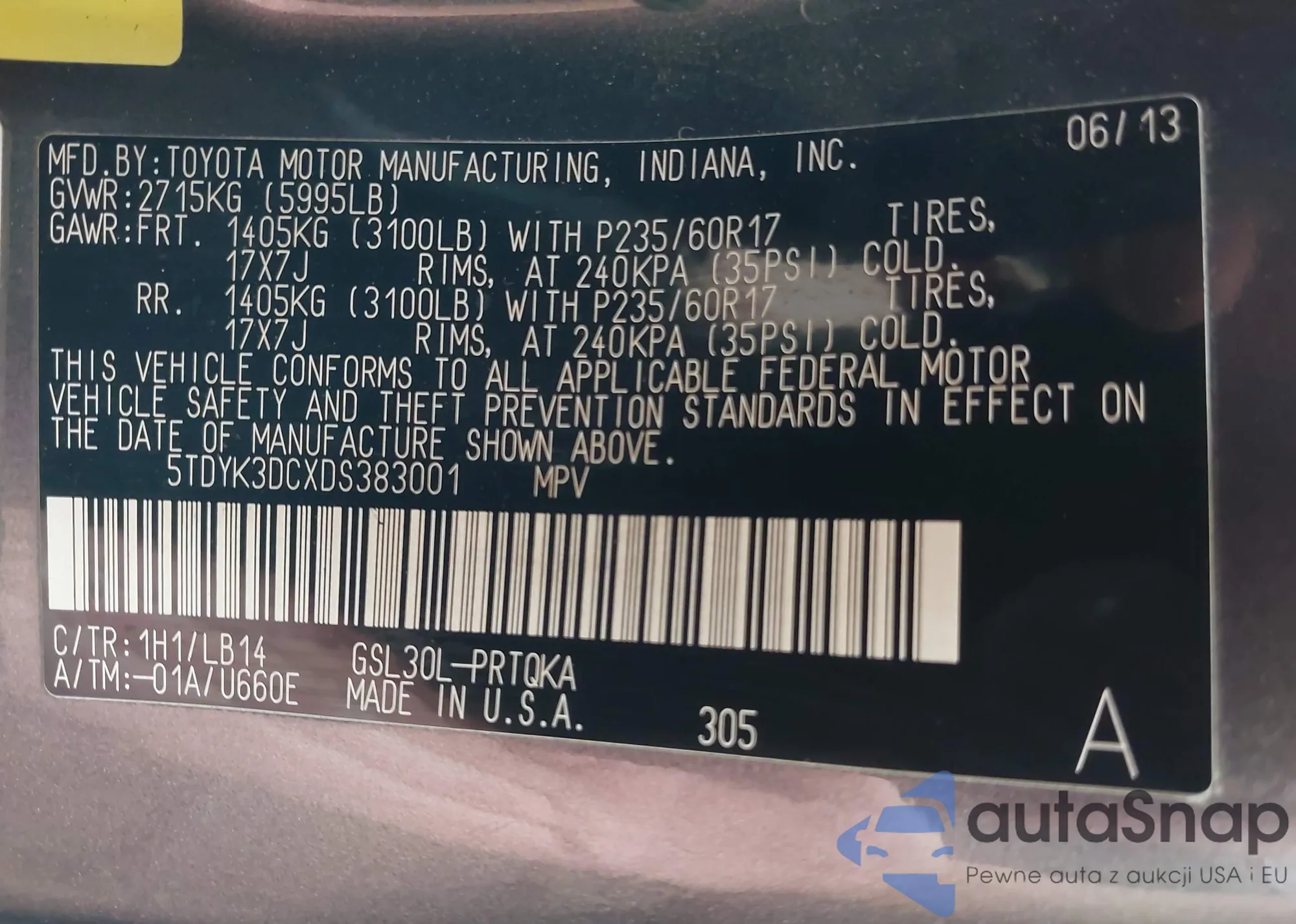 LOT: 43139076 VIN: 5TDYK3DCXDS383001