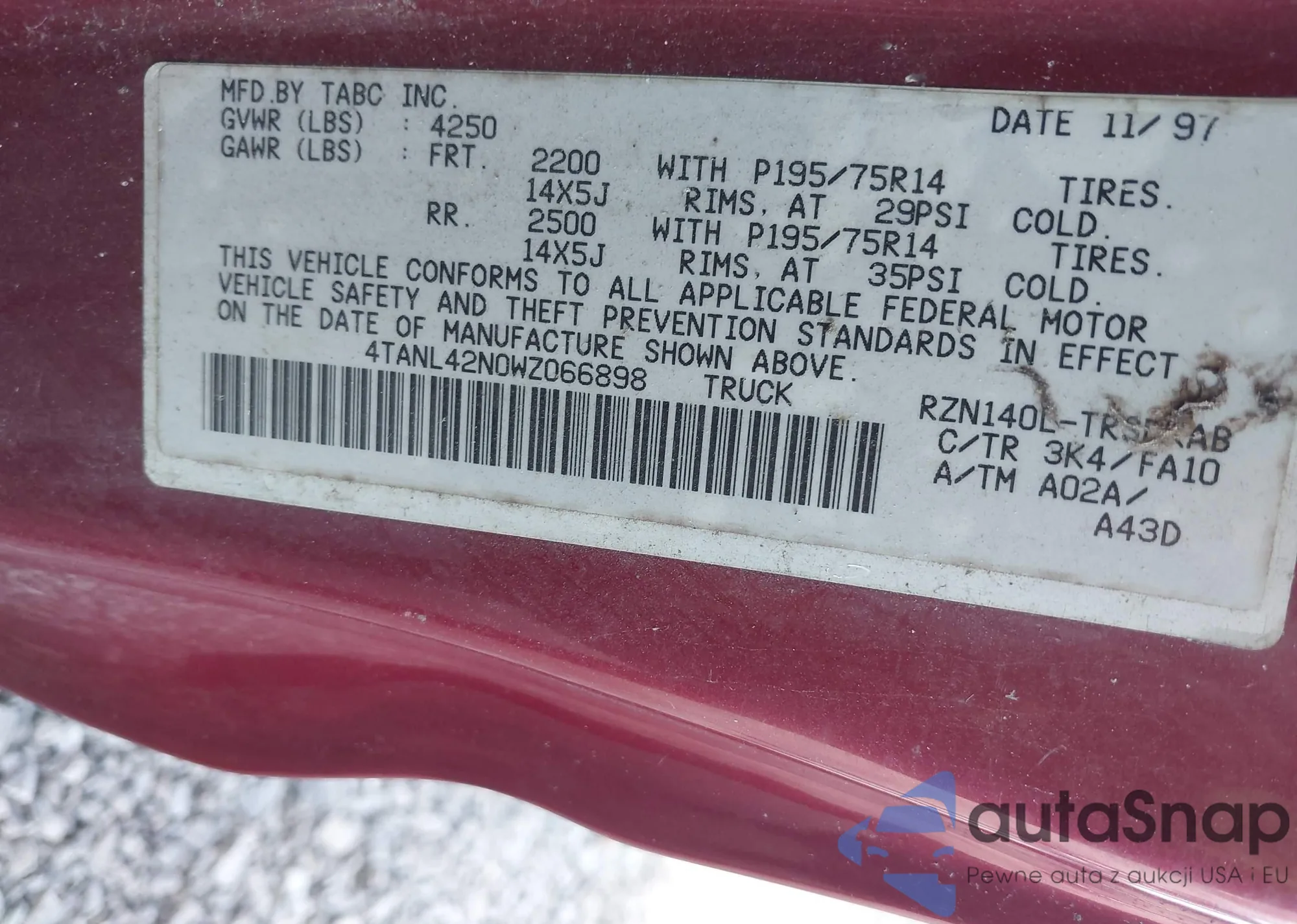 • VIN 4TANL42N0WZ066898