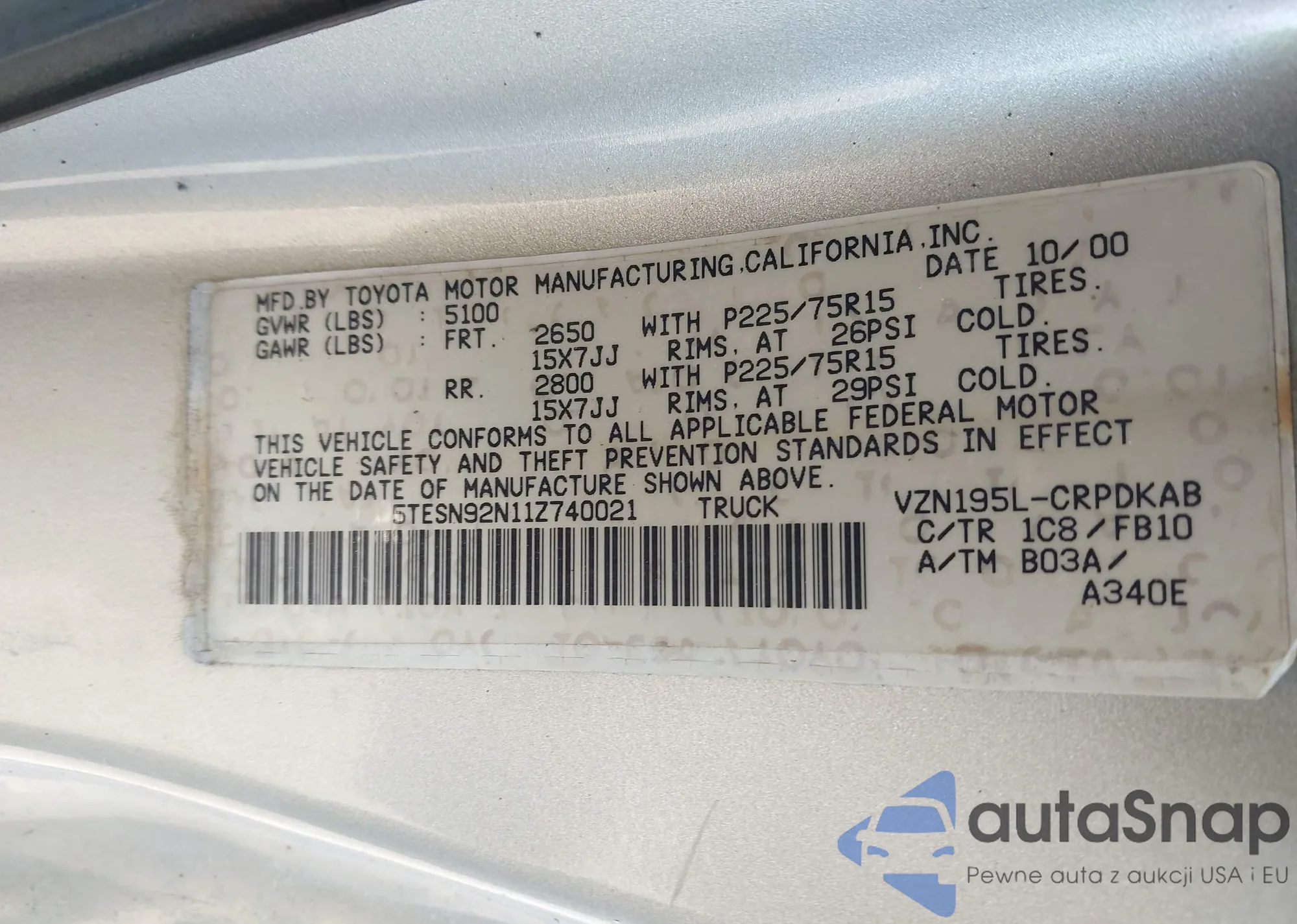 LOT: 43989229 VIN: 04TAVL52N4VZ32887