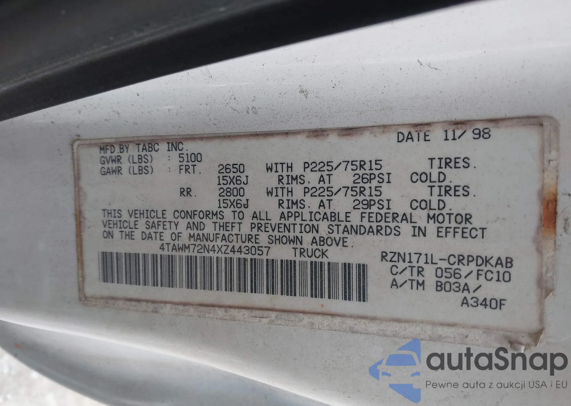 LOT: 44228906 VIN: 4TAWM72N4XZZ44305