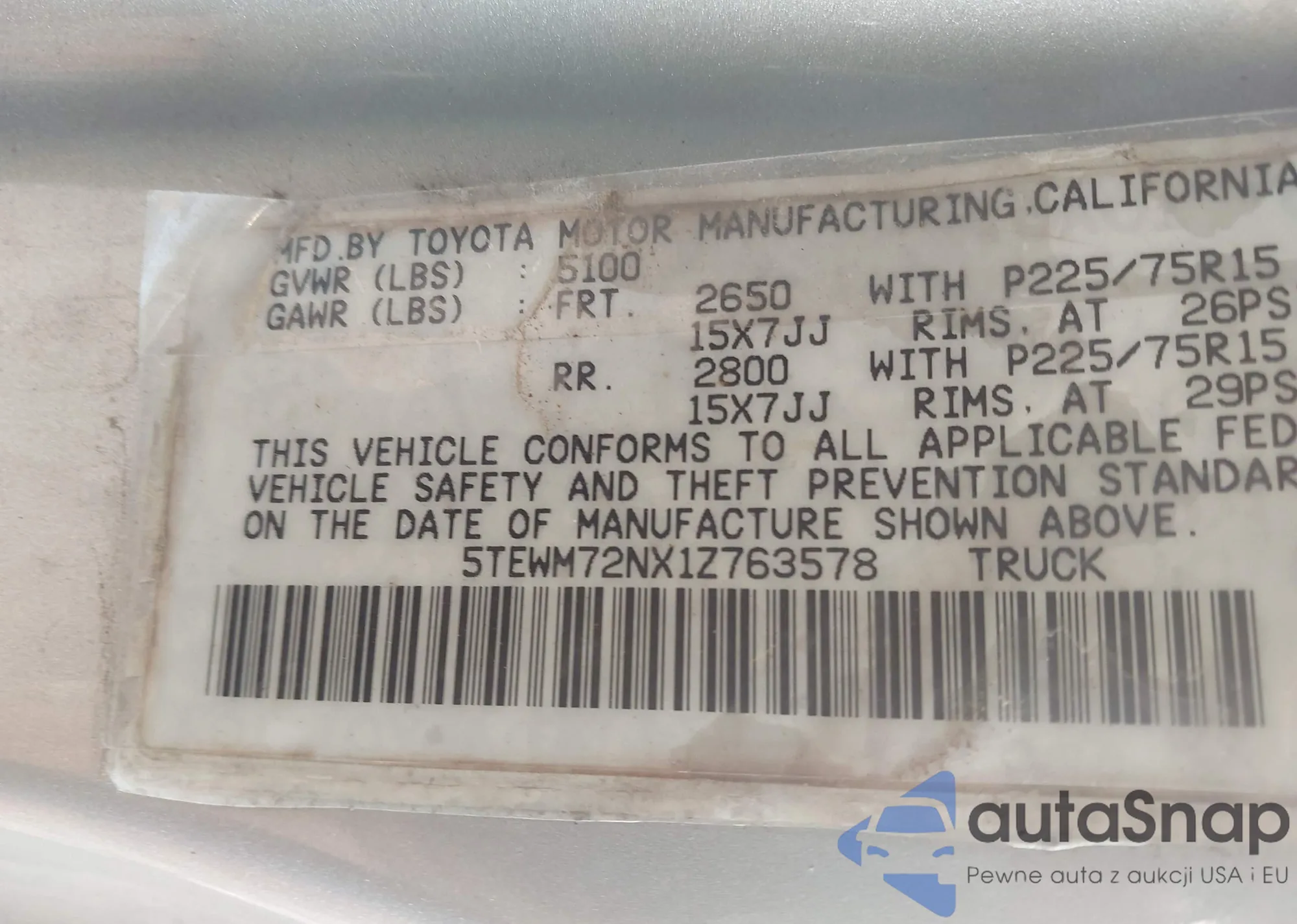• VIN 5TEWM72NX1Z763578