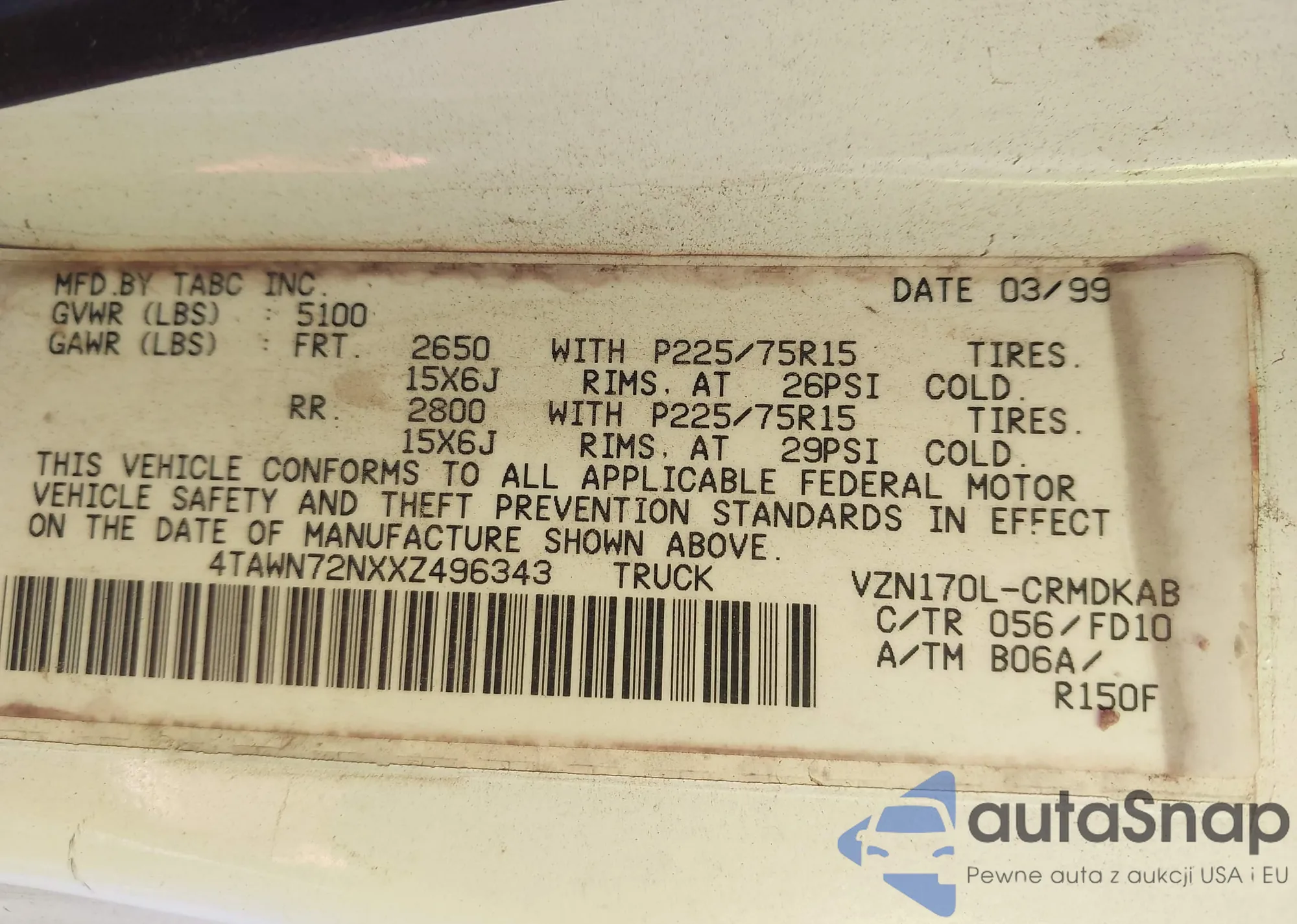 • VIN 4TAWN72NXXZ496343