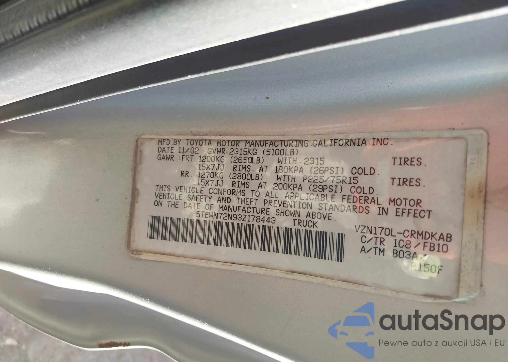 LOT: 44316089 VIN: 5TEWN72N93Z178443